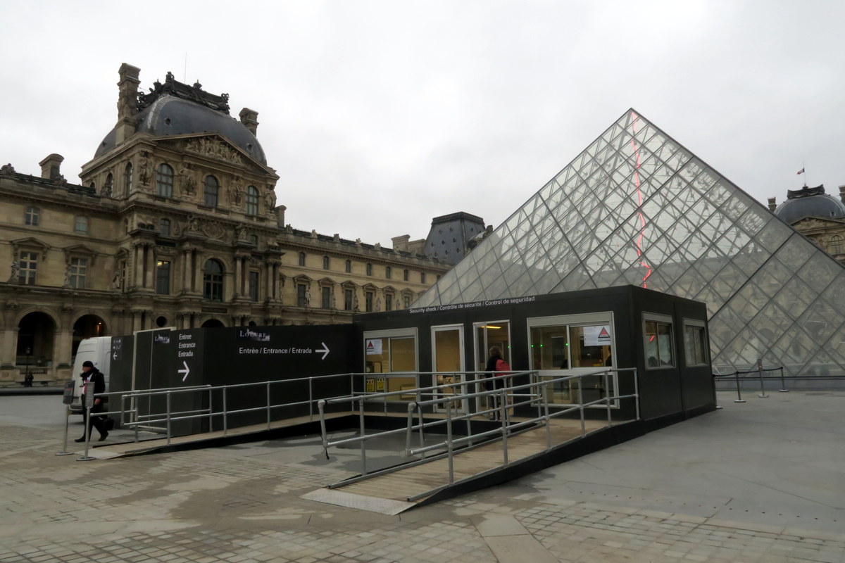 Так как в Париже сейчас опасаются террористов, то перед входом в эту пирамиду добавили ещё и сарайчик, в котором служба безопасности проверяет людей на наличие оружия или бомбды. Интересно, что парижане думают об этом сарайчике!