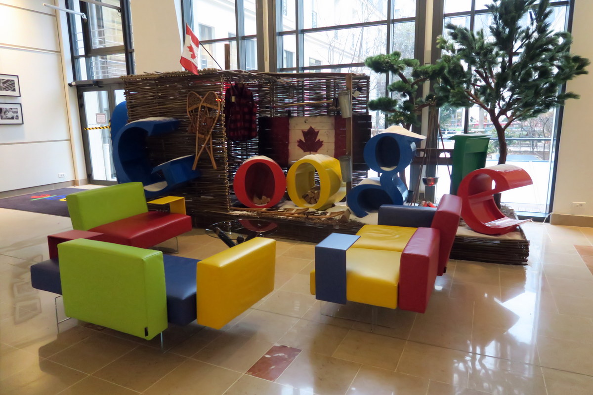 Правильно! Это же Парижский офис Гугла. Как я писал раньше, они у нас по всему миру разбросаны, и в любой можно зайти по удостоверению. Это 21й офис, что я посещаю. Не спрашивайте почему у них тут канадские флаги висят. Я и сам не знаю.