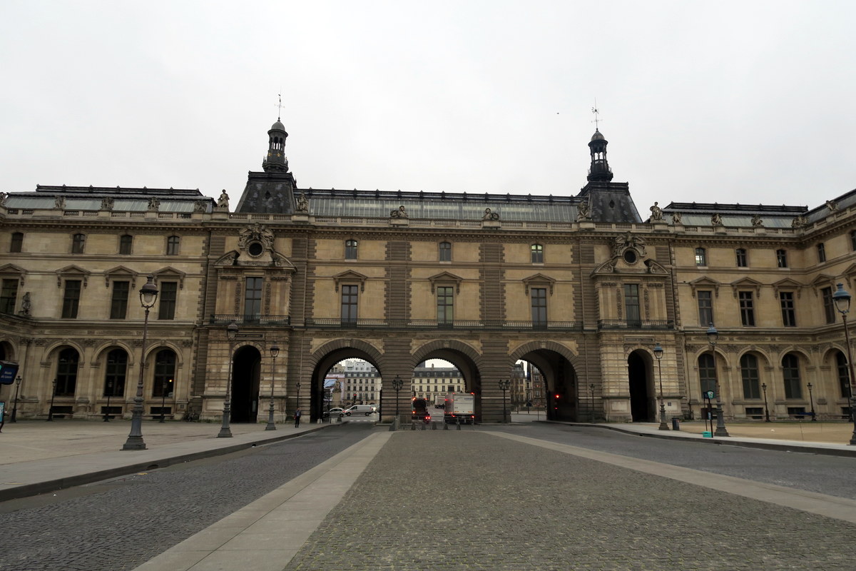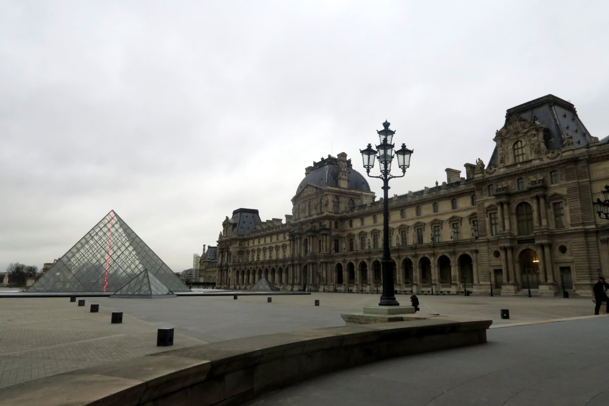 А вот вход в Лувр. Первая королевская крепость стояла на этом месте ещё в XII веке, но современное здание начали стоить в 1546 году при короле Франциске I. С тех пор каждый французский король считал своим долгом добавить к Лувру какое нибудь крыло, и дворец феноменально разросся. Сегодня это длиннейшие безликие стены, окружающие огромные пустые площади.