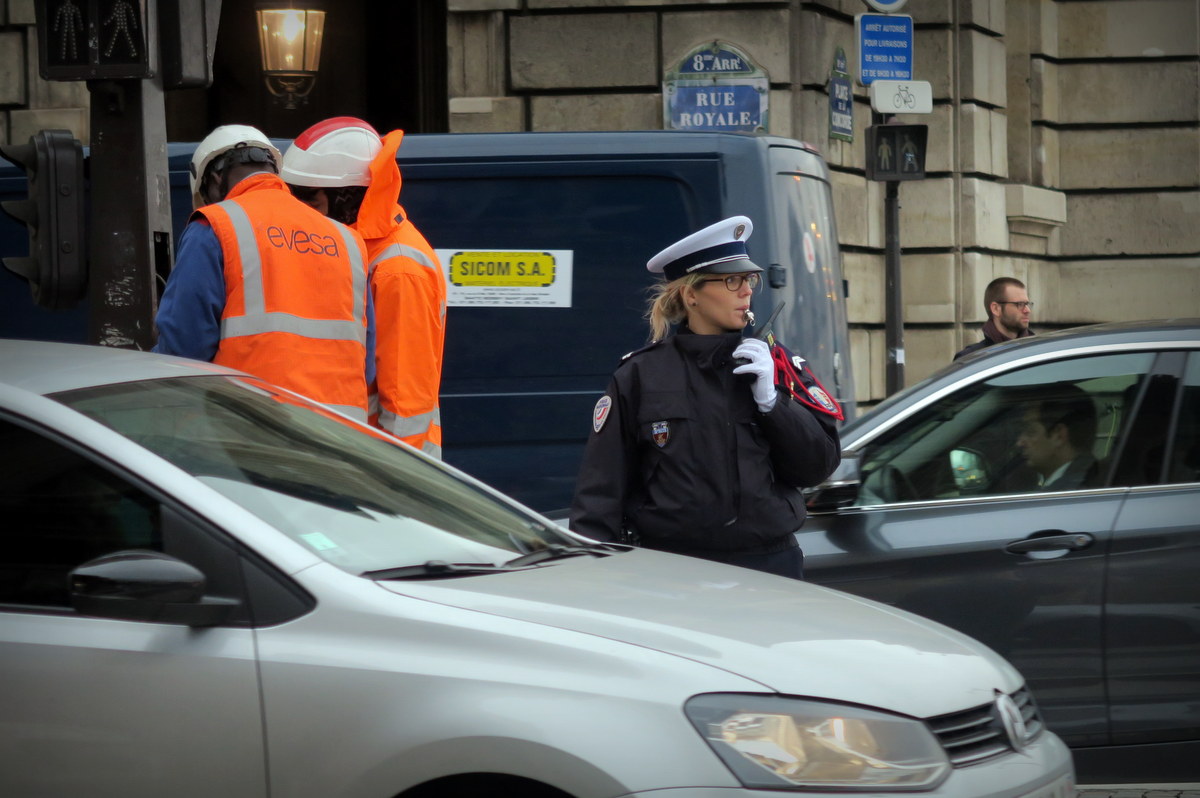 В центре старого Парижа выключили светофоры, и движением командуют местные ГАИшницы. Они махают руками в белых перчатках, свистят в свисток, и всячески пытаются сделать так, чтоб машины не ехали куда не надо.
