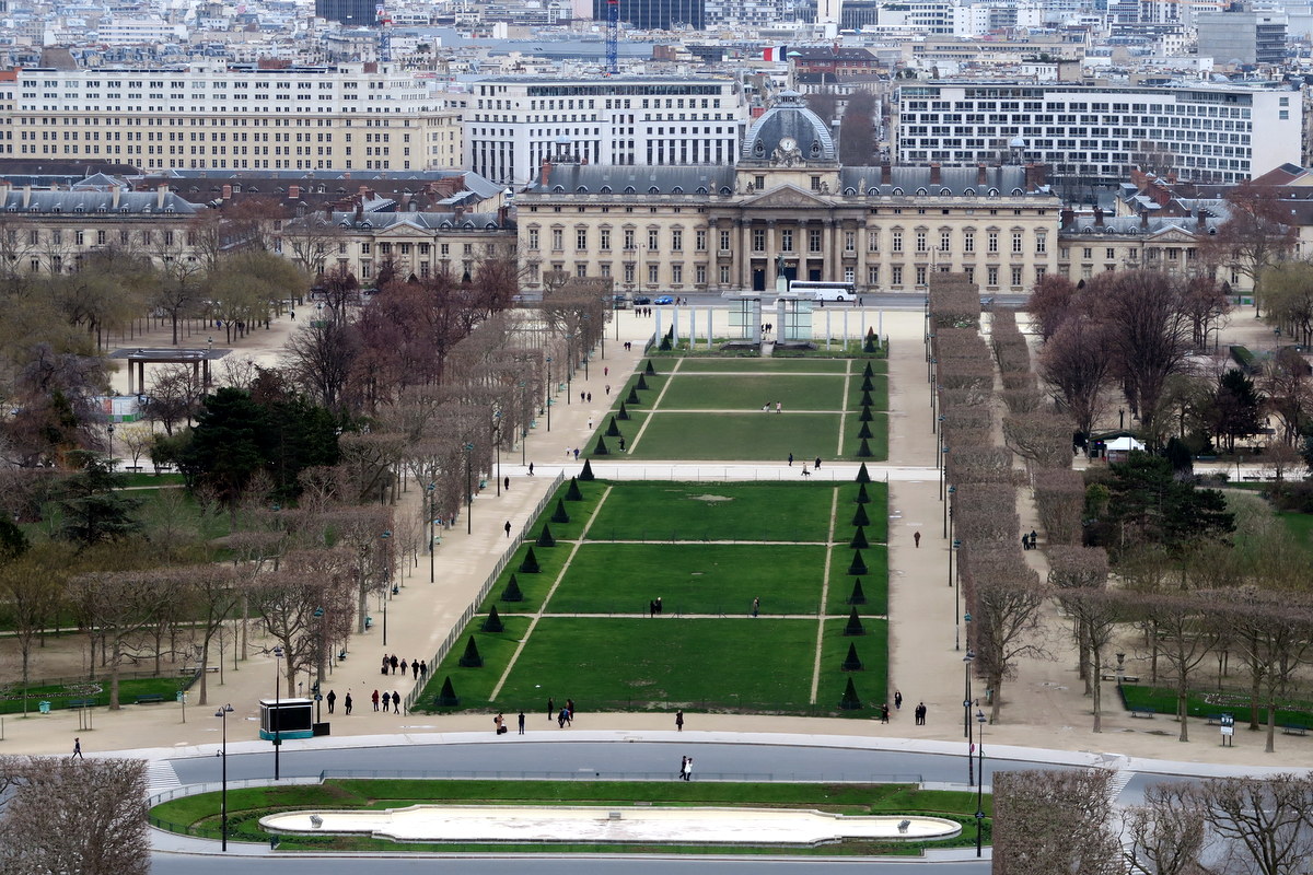 С первого уровня красивый вид на Марсово Поле. В конце его стоит военная школа.
