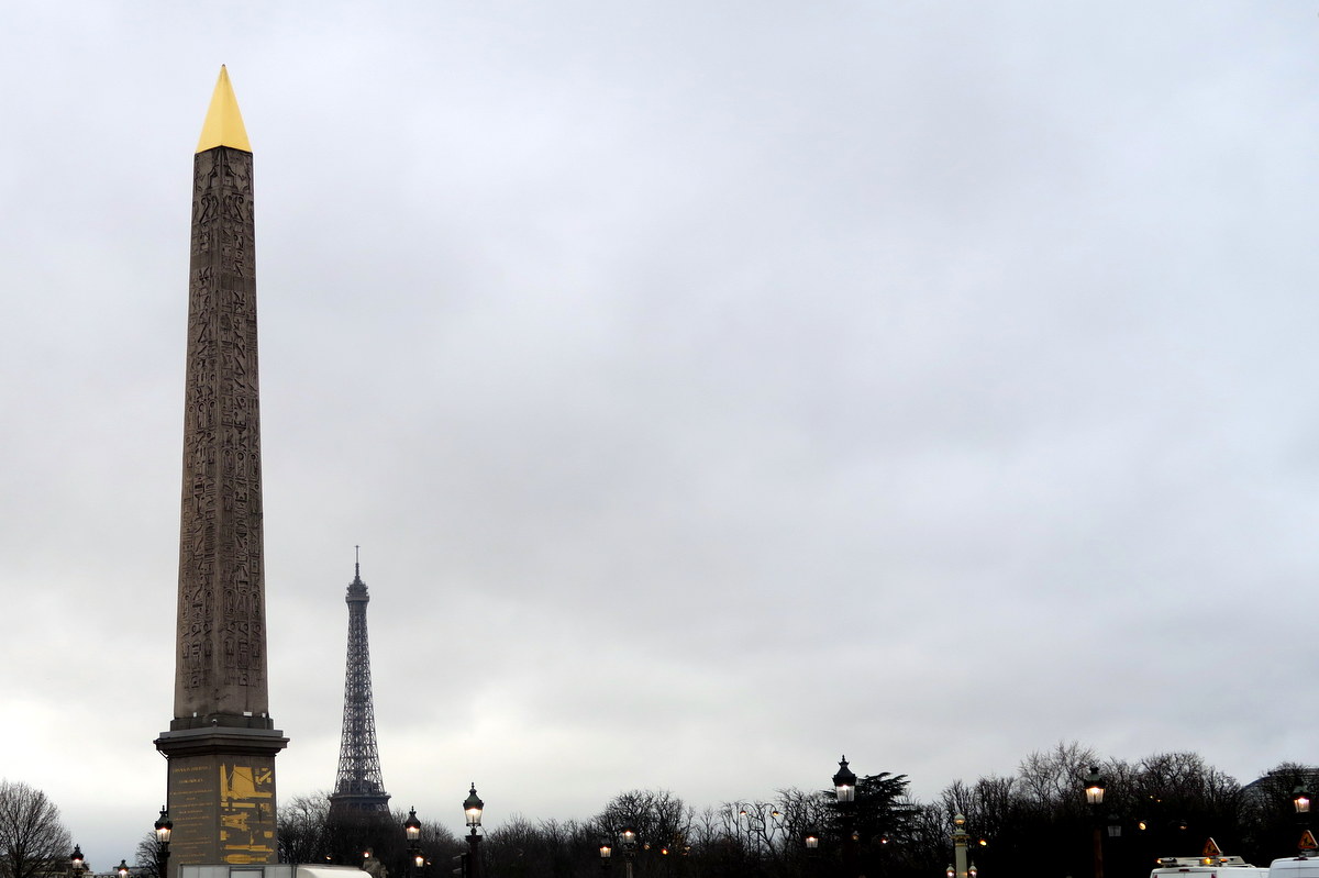 Огромный обелиск на площади Согласия привезли в XIX веке из Египта. Местный правитель подарил его французскому народу в 1833. Считается, что обелиску около 3000 лет, и он был создан во времена правления Рамзеса II. Его поверхность покрыта древними иероглифами. Сзади него уже виднеется Эйфелева Башня.