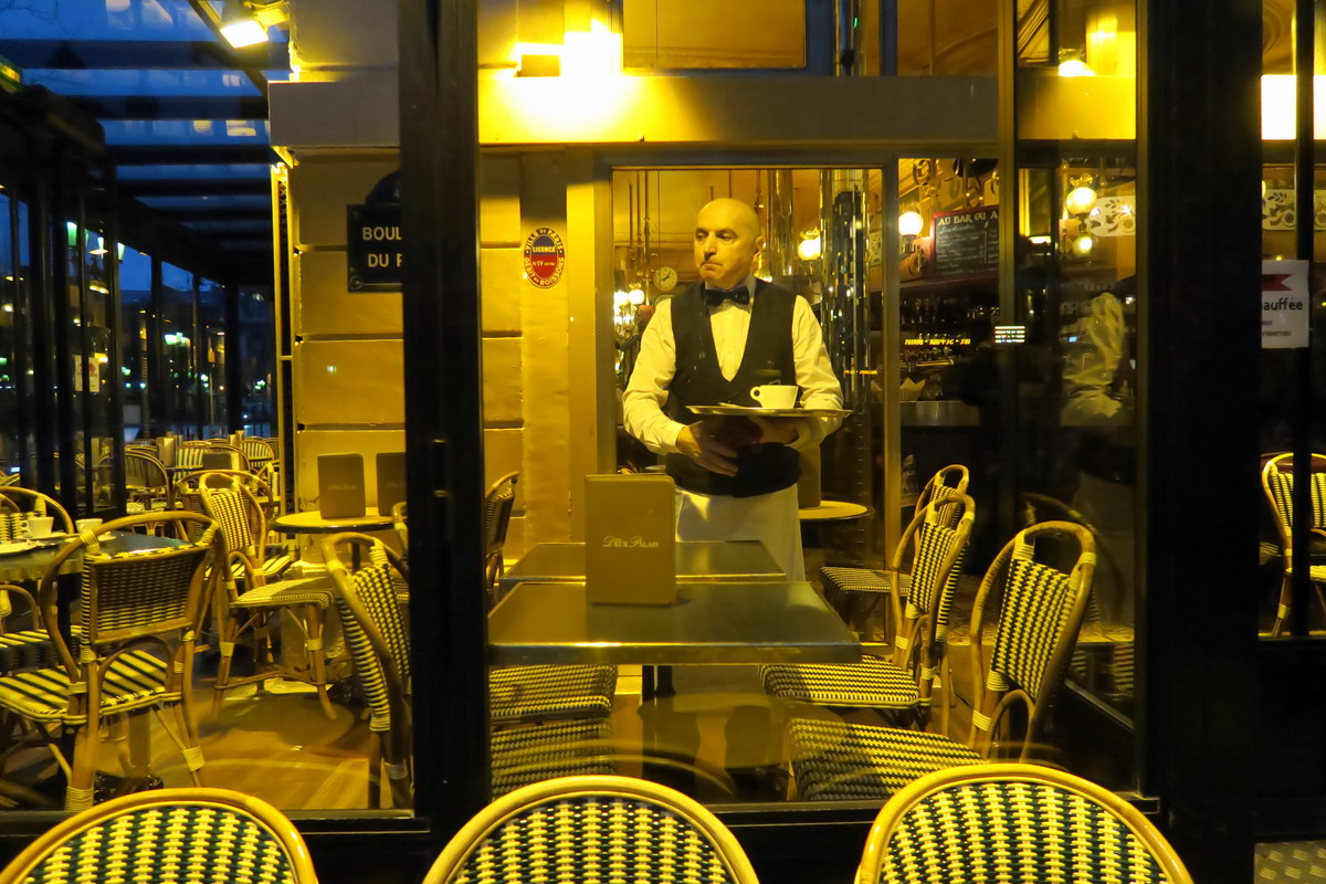 Город начинает просыпаться. Эталонные парижские официанты начинают день эталонных парижскик кафешек.
