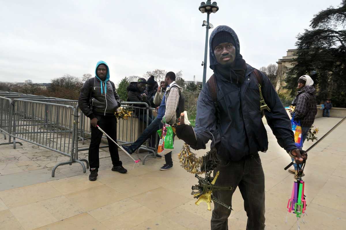 Спускаюсь вниз. Что-то я проголодался. Под башней караулят африканцы, торгующие безделушками в форме башни. Как видно на фоткографии, фотографироваться они не очень любят.