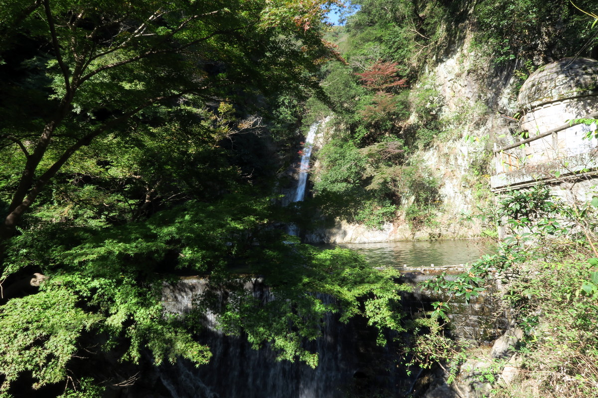 Прямо за станцией начинаются горы. Водопад, к которому ны направлялись действительно был не очень далеко, но подниматься пришлось вверх и вверх, так что всем нам пришлось попотеть. Зато, как постоянно бывает в Японии, натуральный водопад немного улучшили, построив под ним каменный порог, который образовывает теперь небольшой прудик.