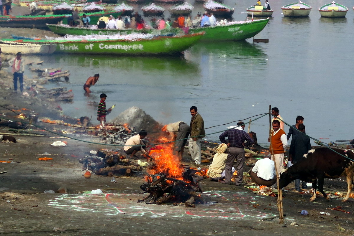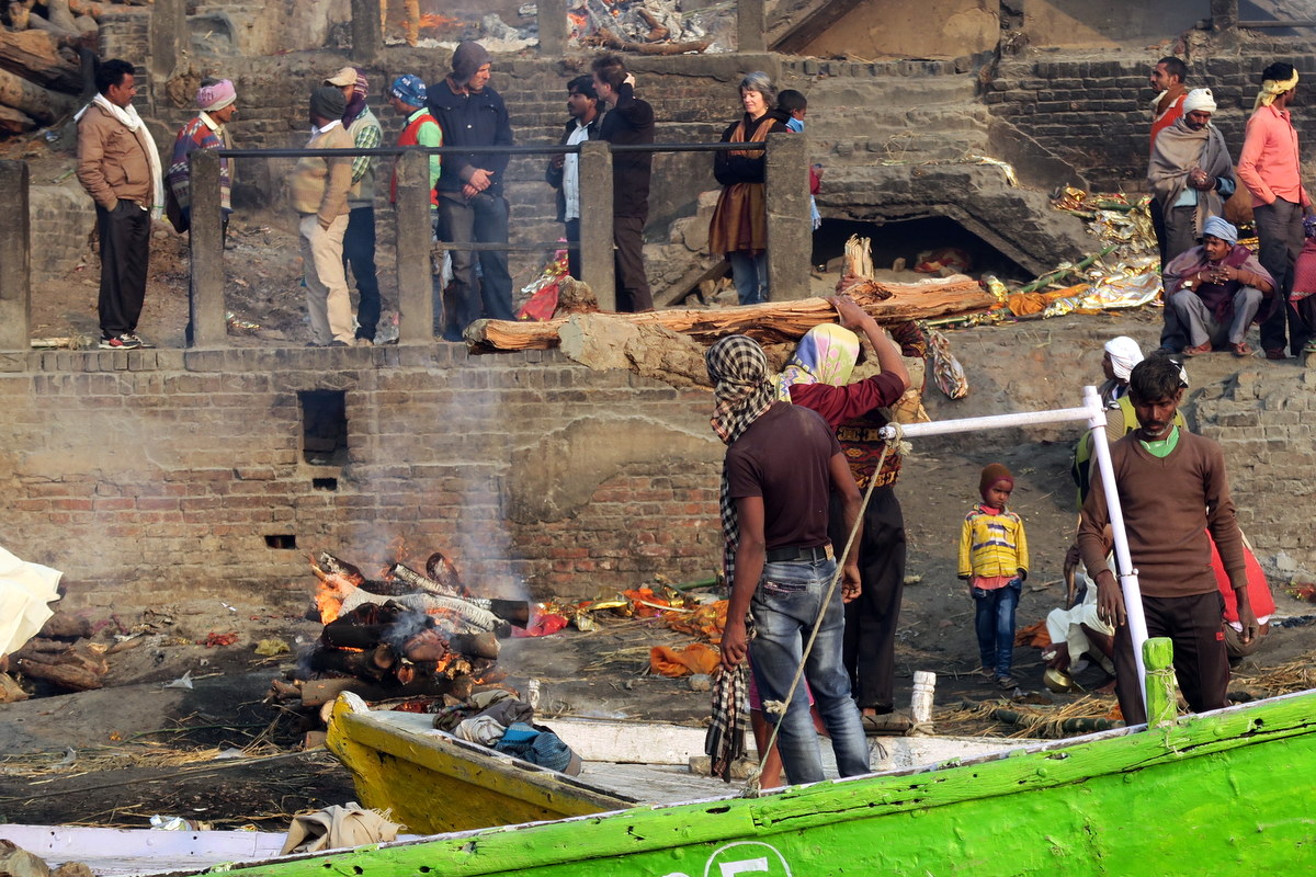 Как правило над костром стоят родственники умершего. По традиции они должны радоваться, что покойный удостоился такой высокой чести, быть кремированным на берегу Ганга. Плакать здесь нельзя, чтобы душа виновника торжества не дай бог не решила задержаться, увидев горе родственников. Поэтому такие церемонии редко посещают женщины.