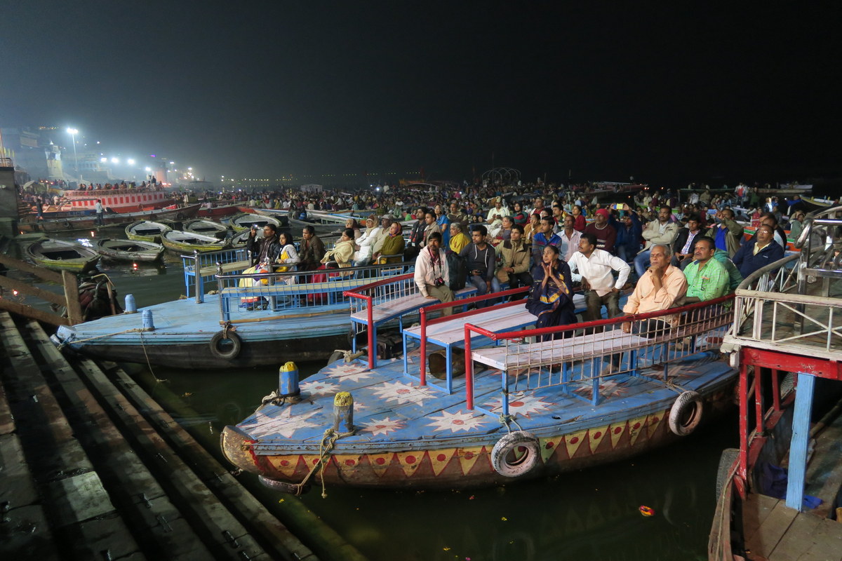 Толпы людей собираются посмотреть на это зрелище, некоторые сидят на гхате перед сценой, другие смотрят с лодок у берега.