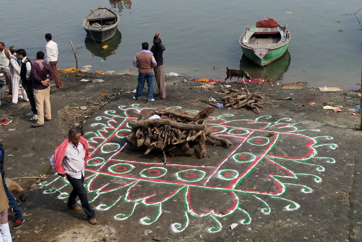 "Видишь, как красиво место разукрасили цветным песком?" сказал мне один из местных работников "Это значит богатого человека сжигать будут. Из высокой касты."