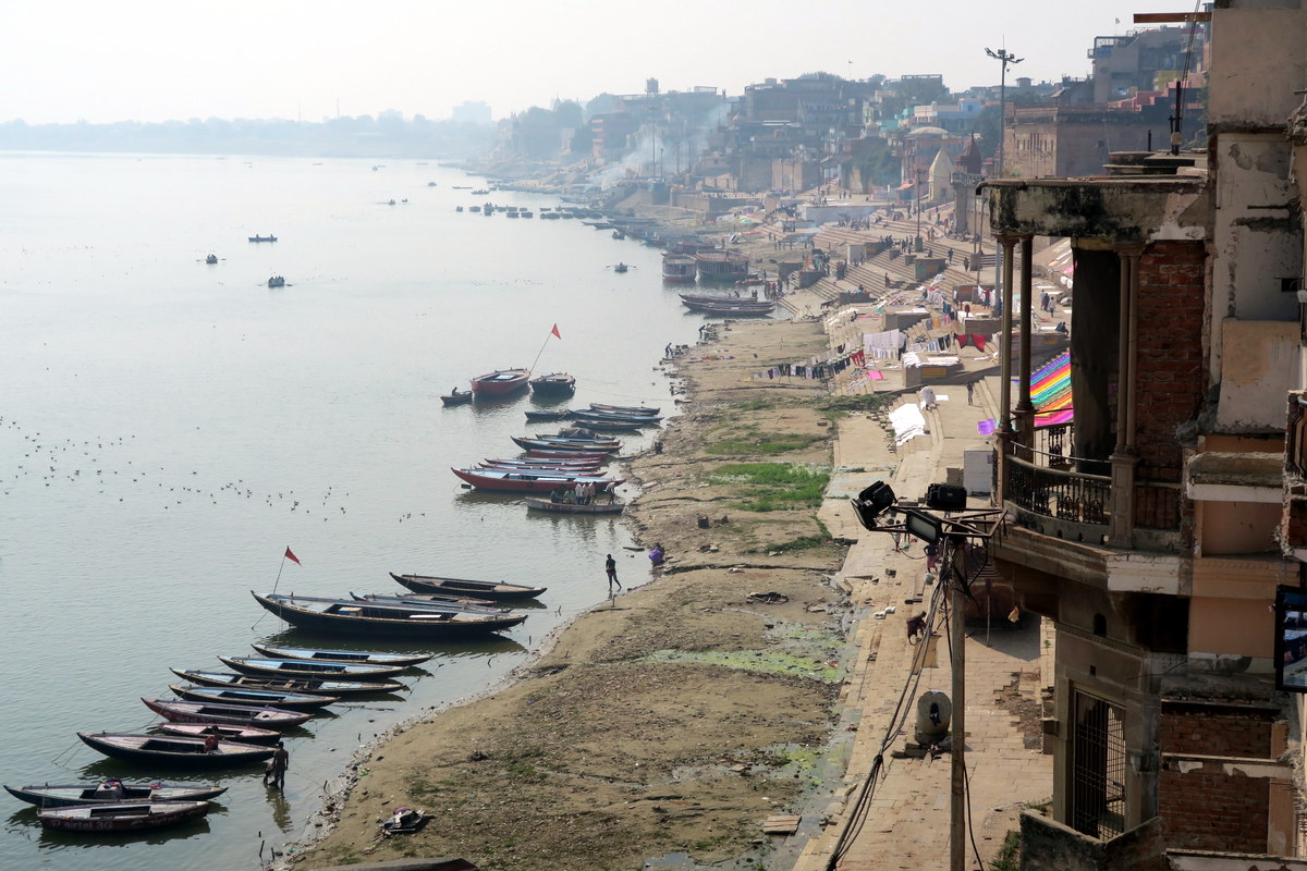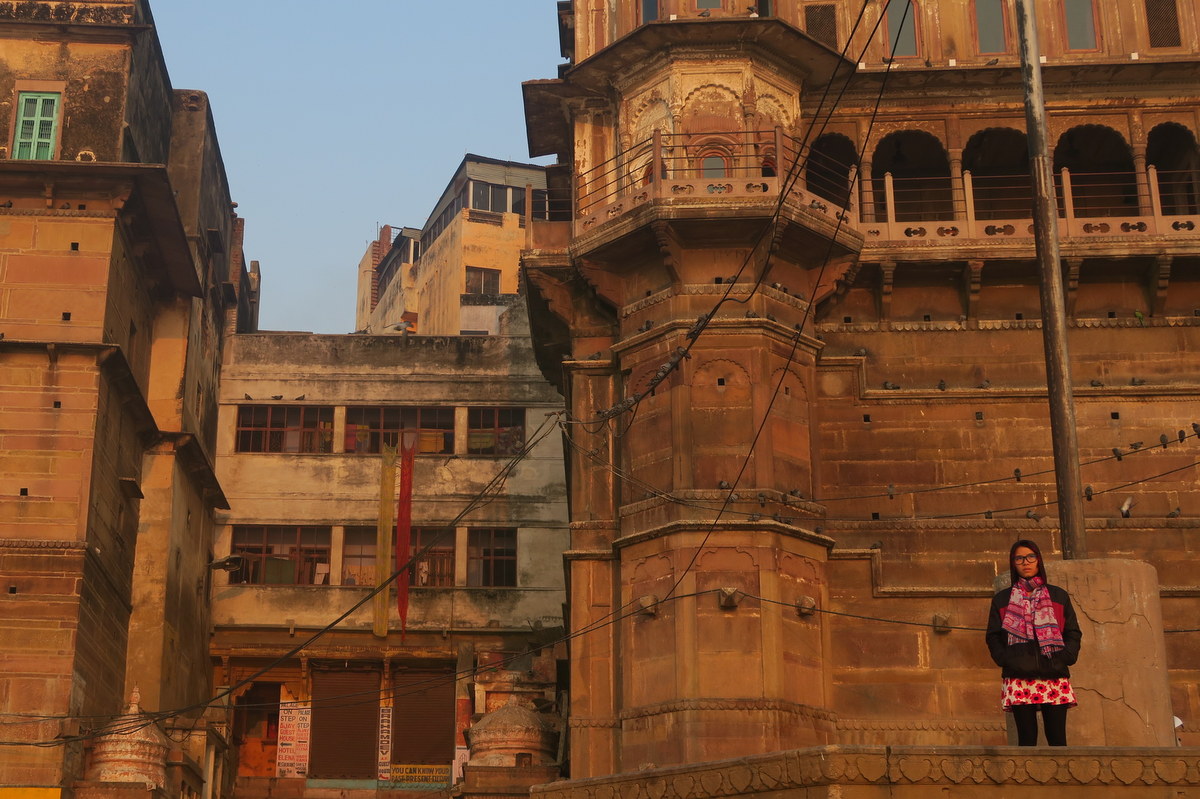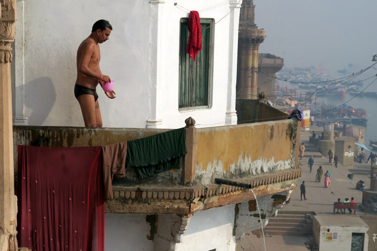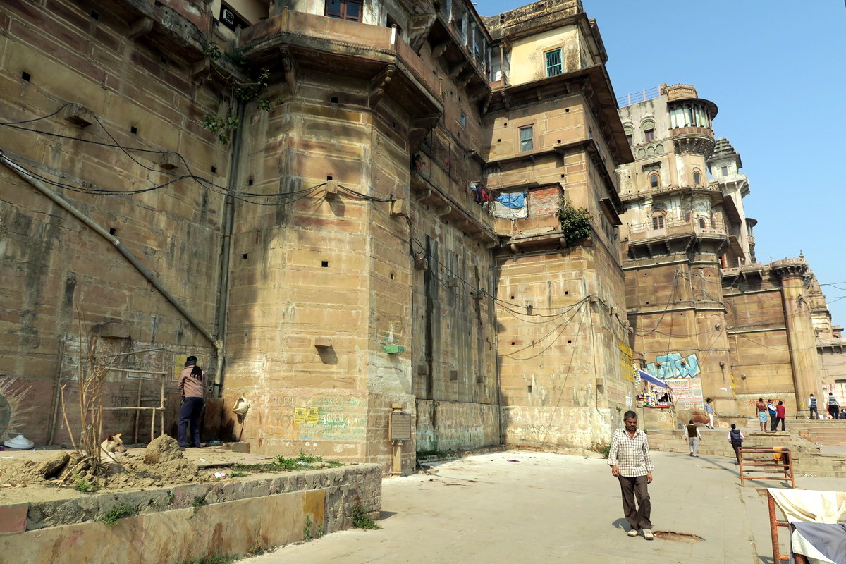 Сверху все эти старые дворцы давно превратились в отели. По индийским меркам тут дорого, комната с видом на Ганг может стоить $30-$40 в сутки (для сравнения, буквально в квартале отсюда уже можно снять что-то в два раза дешевле). Но зато как приятно сидеть с утра на балконе с видом на Ганг и гхаты с высоты.