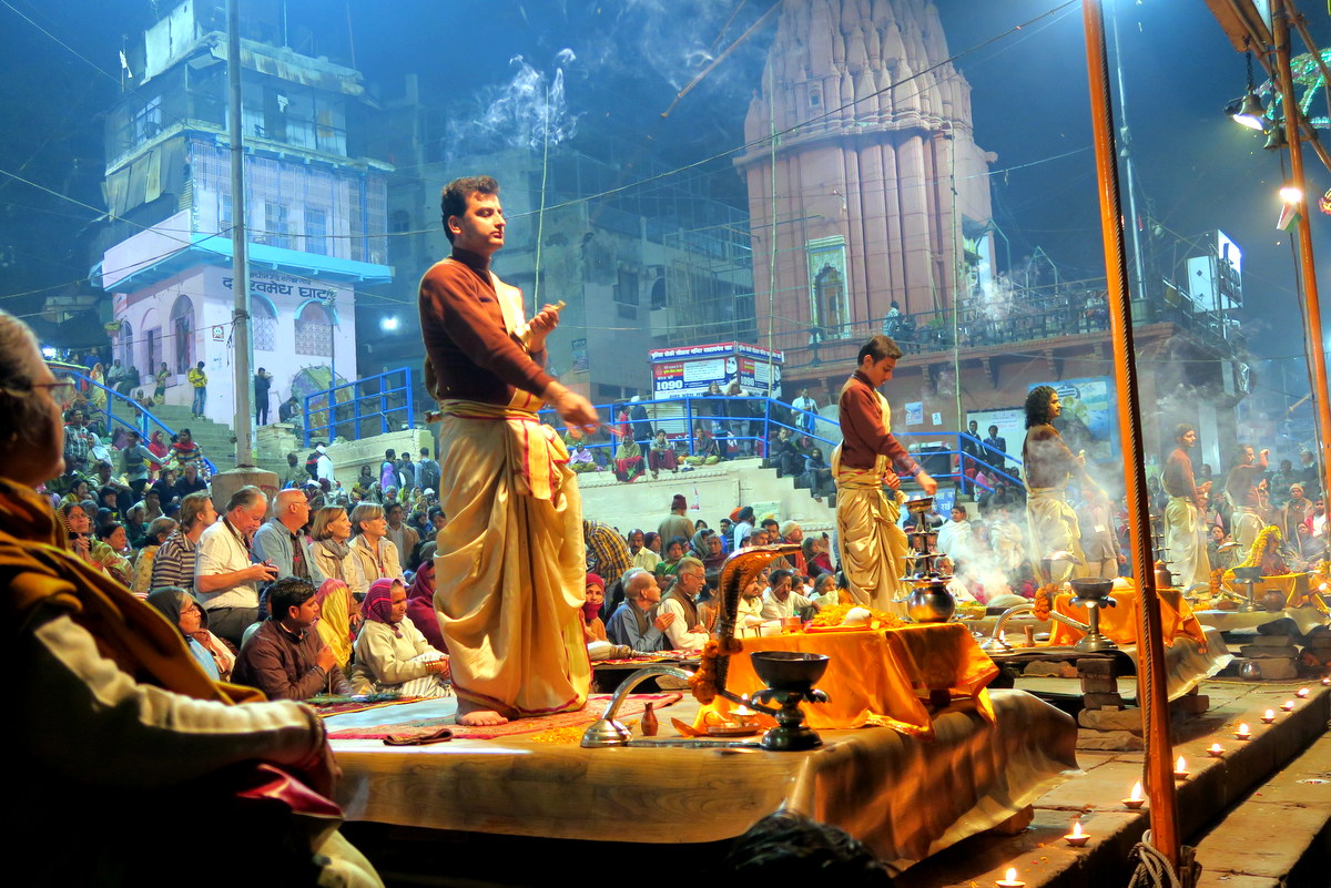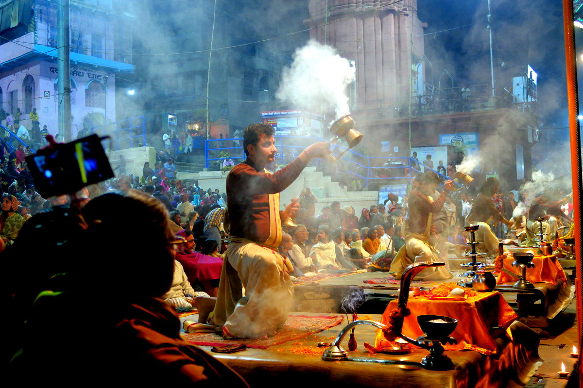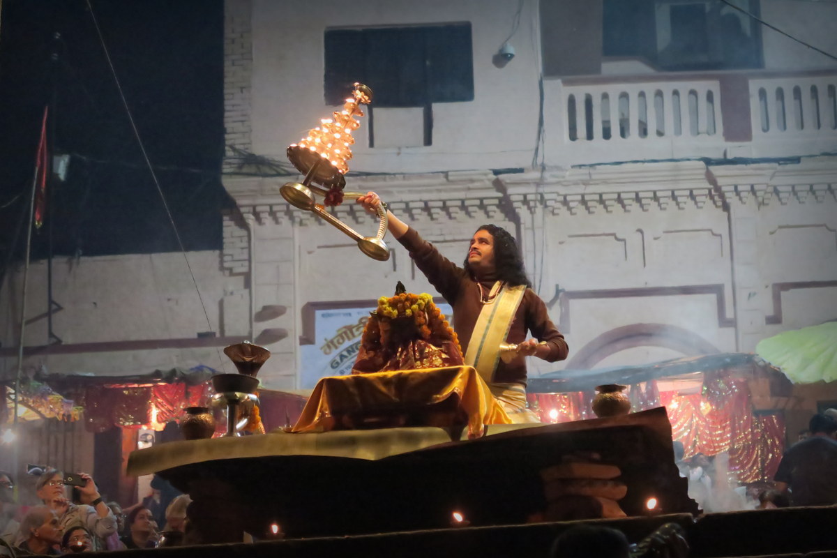 Но перейдём от грустного к приятному. Каждый вечер на одном из центральных гхатов проходит красочная церемония Арати. Тут труппа талантливых индусов (наверняка брахманов) поёт песни, и изображает сложные хореографические номера горящими и дымящими лампадами.