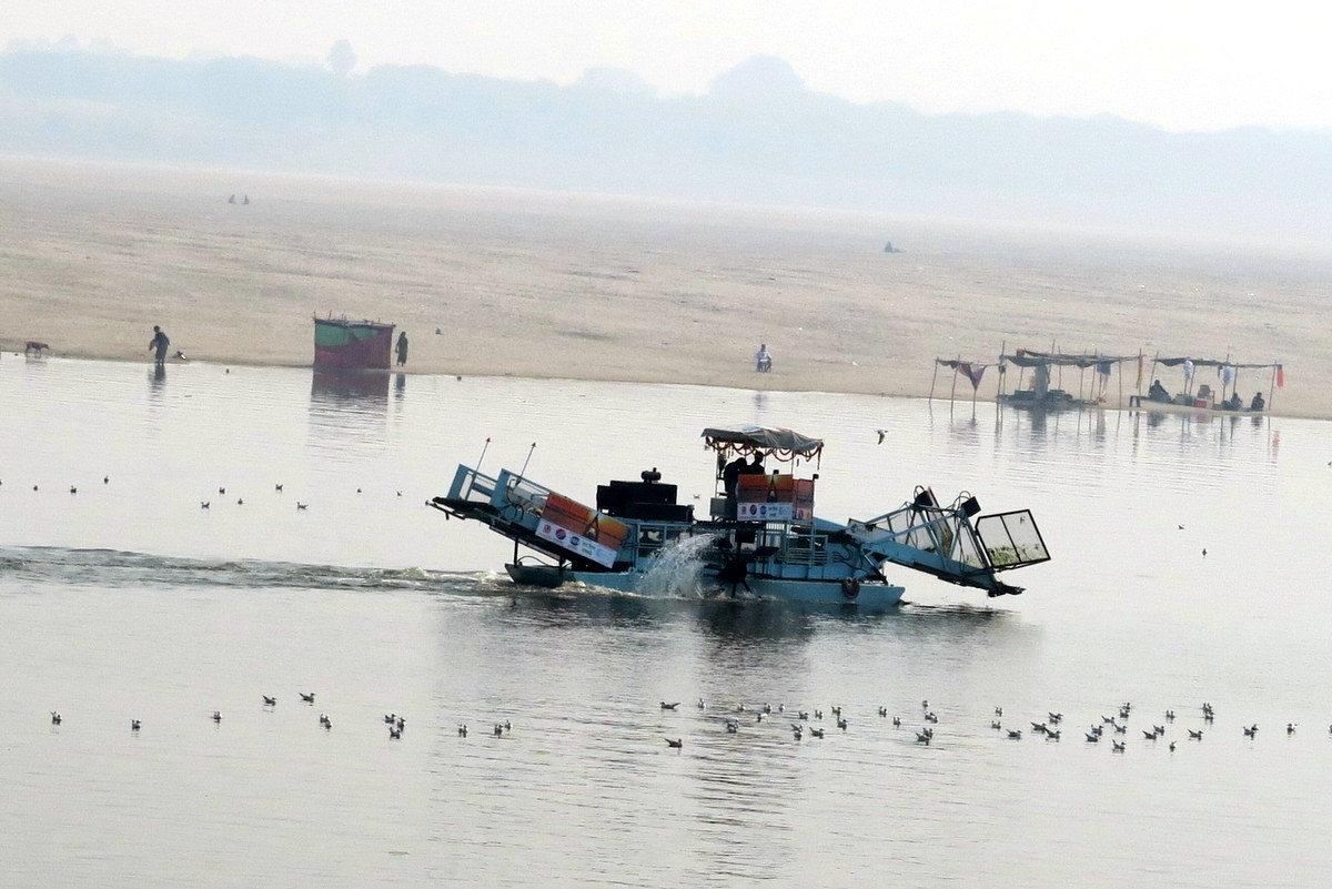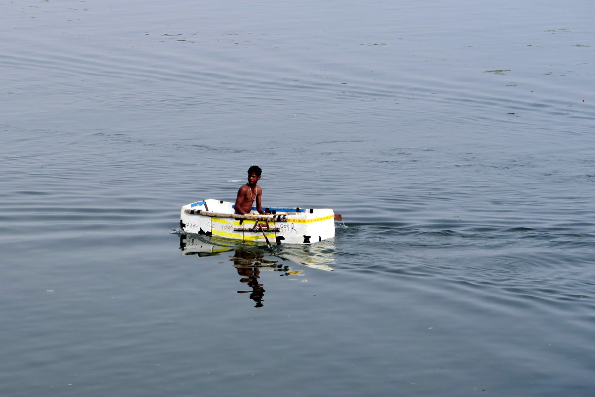 Все знают, что Ганг - священная река. Согласно индуистской традиции, кроме того, что тут считается почётным кремировать мёртвых, в ней полезно купаться, пить её священную воду, дарить реке различные дары... Короче вся эта священная активность на протяжении долгих веков, капитально загрязнила Ганг, на его поверхности плавают островки различного мусора.