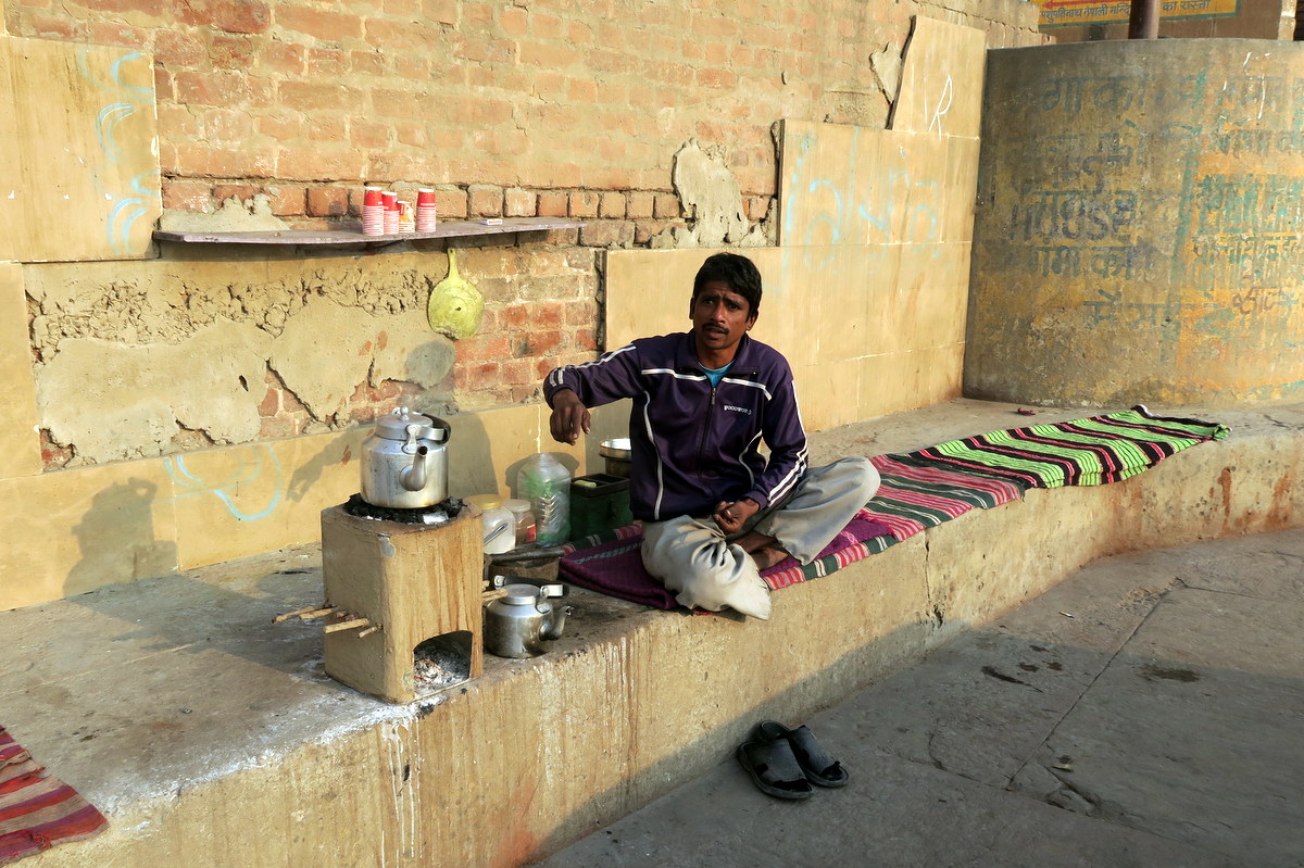 А вот предприимчивый молодой человек открыл прямо на ступенях гхата небольшой чайный салон. Интересно, где он берёт водичку для чая то?..