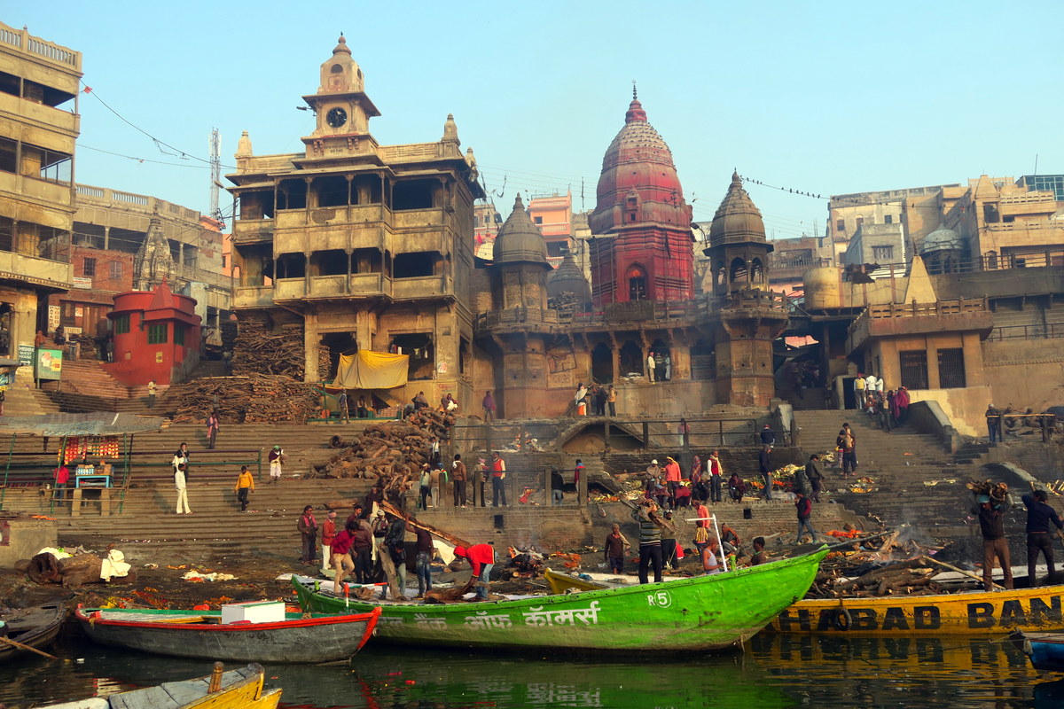 Ну вот, приплыли к самому интересному гхату. Я не зря попросил лодочника направиться сюда. Этот гхат называется Маникарника. Здесь круглые сутки кремируют труппы умерших людей. Говорят, что костры Маникарника-гхата горят не переставая уже несколько тысячелетий.