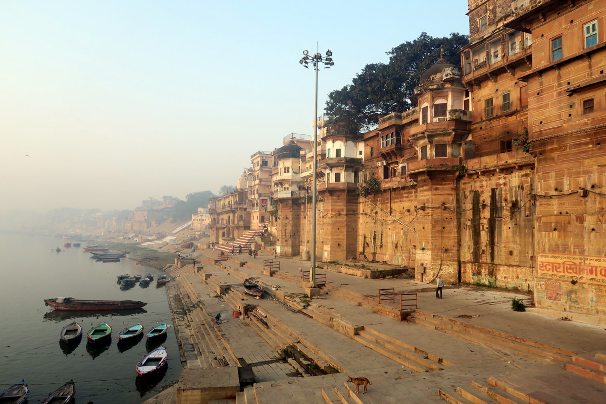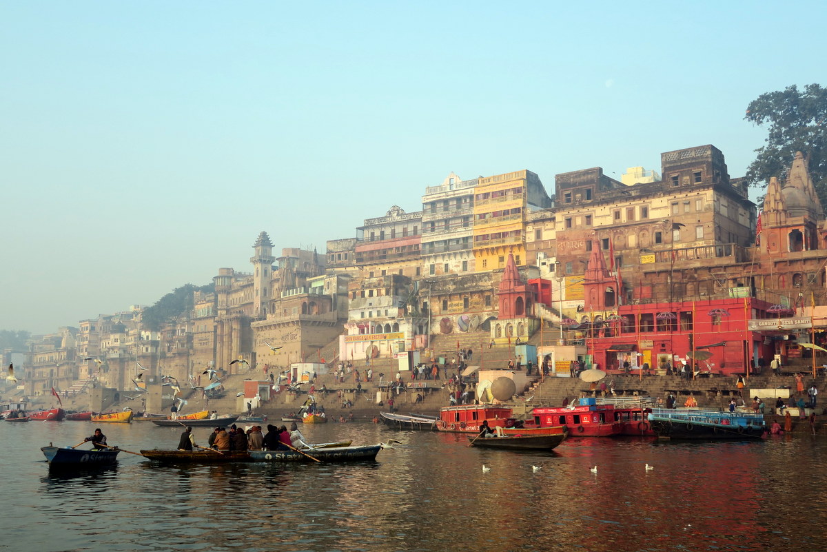 С воды становится понятно, насколько Варанаси пёстрый. Резные башни дворцов и храмов создают очень красивое нагромождение, напоминающее сказочный город.