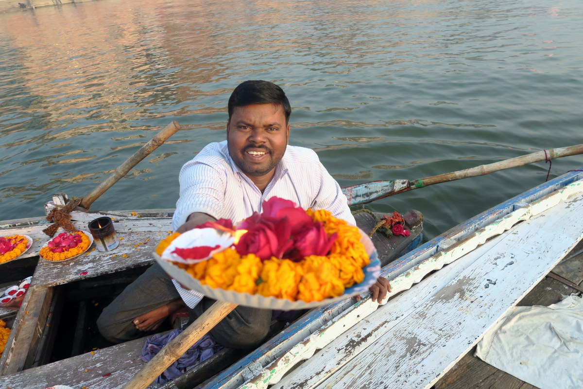 Бывает подплывёт такой к тебе, и говорит на мол, возьми - подаир это священному Гангу. Не надо такие брать. Зачем в реку ещё дополнительный мусор кидать? Тем более что несмотря на все заверения, эти чуваки всё равно в итоге попросят у вас денег. (Рано или поздно в Индии почти все просят денег.)