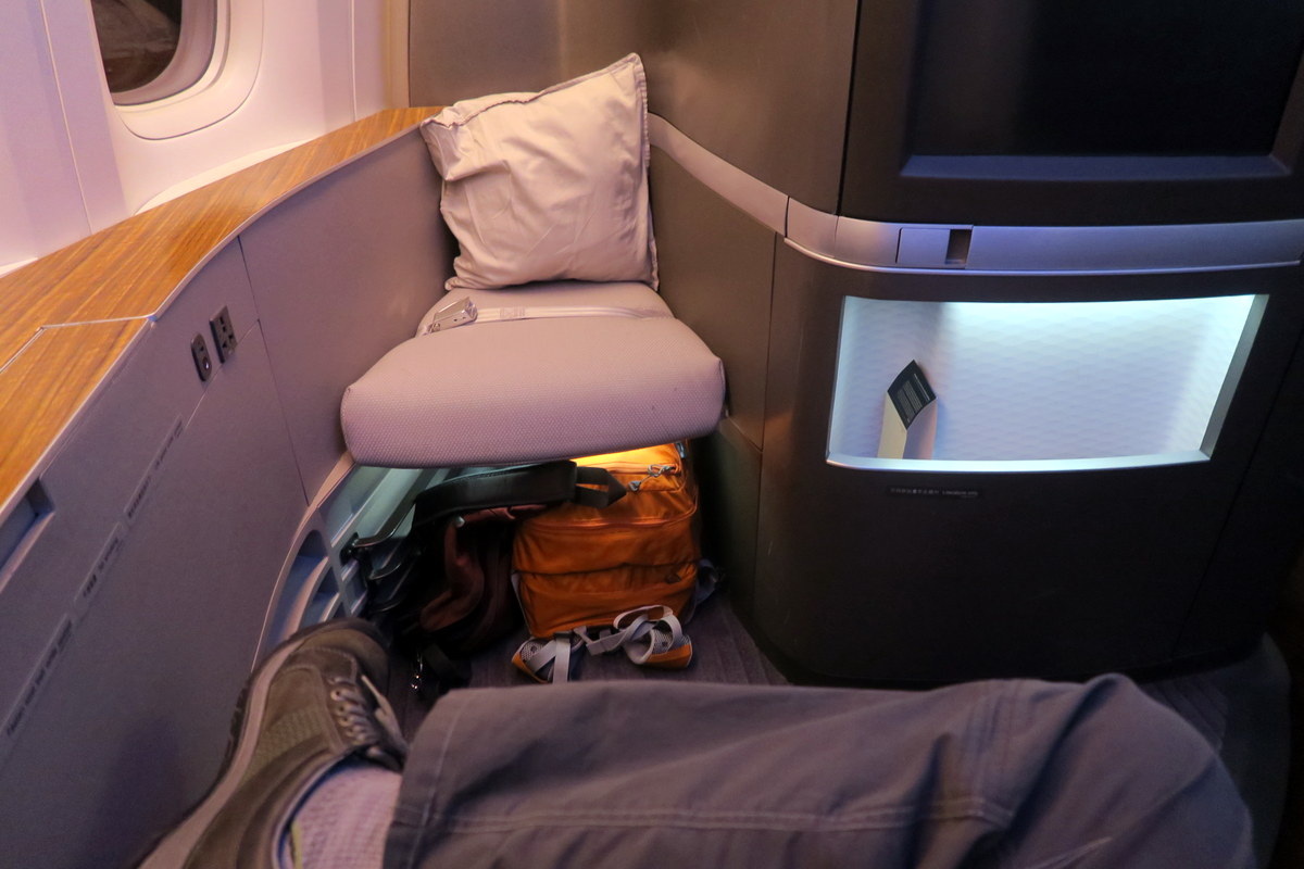 Так как я путешествую с рюкзаком, мне предлагают положить его подсиденье спереди пуфик для ног. Кстати этот пуфик ещё немножечко табуретка, у него есть свой ремень безопасности. Если вы летите с товарищем он может вас навестить. Главное, чтоб пристегнулся.