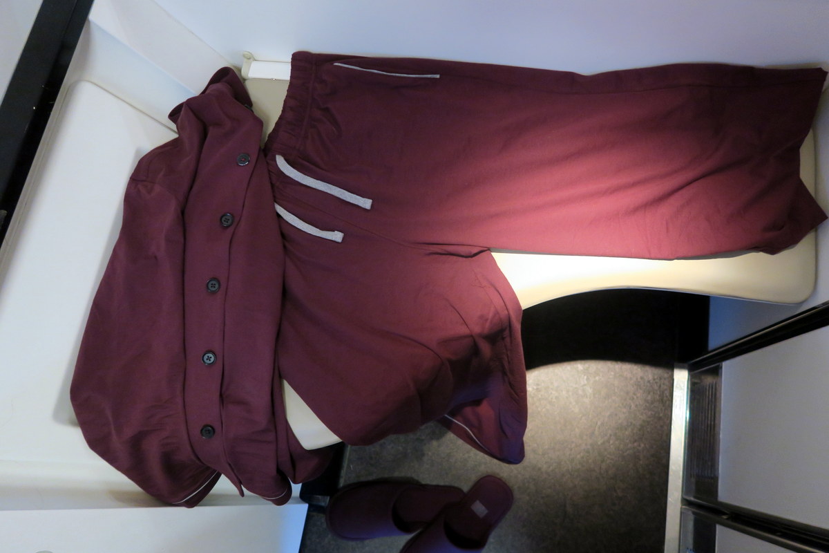 Я посмотрел фильм, потом решил всё же примерить пижаму. Обычно я их не одеваю, но раз уж решил вам рассказать про первый класс... Пошёл в туалет переодеваться. Места там полно, можно даже разложить пижамку напоказ. Она модная, малиновая.
