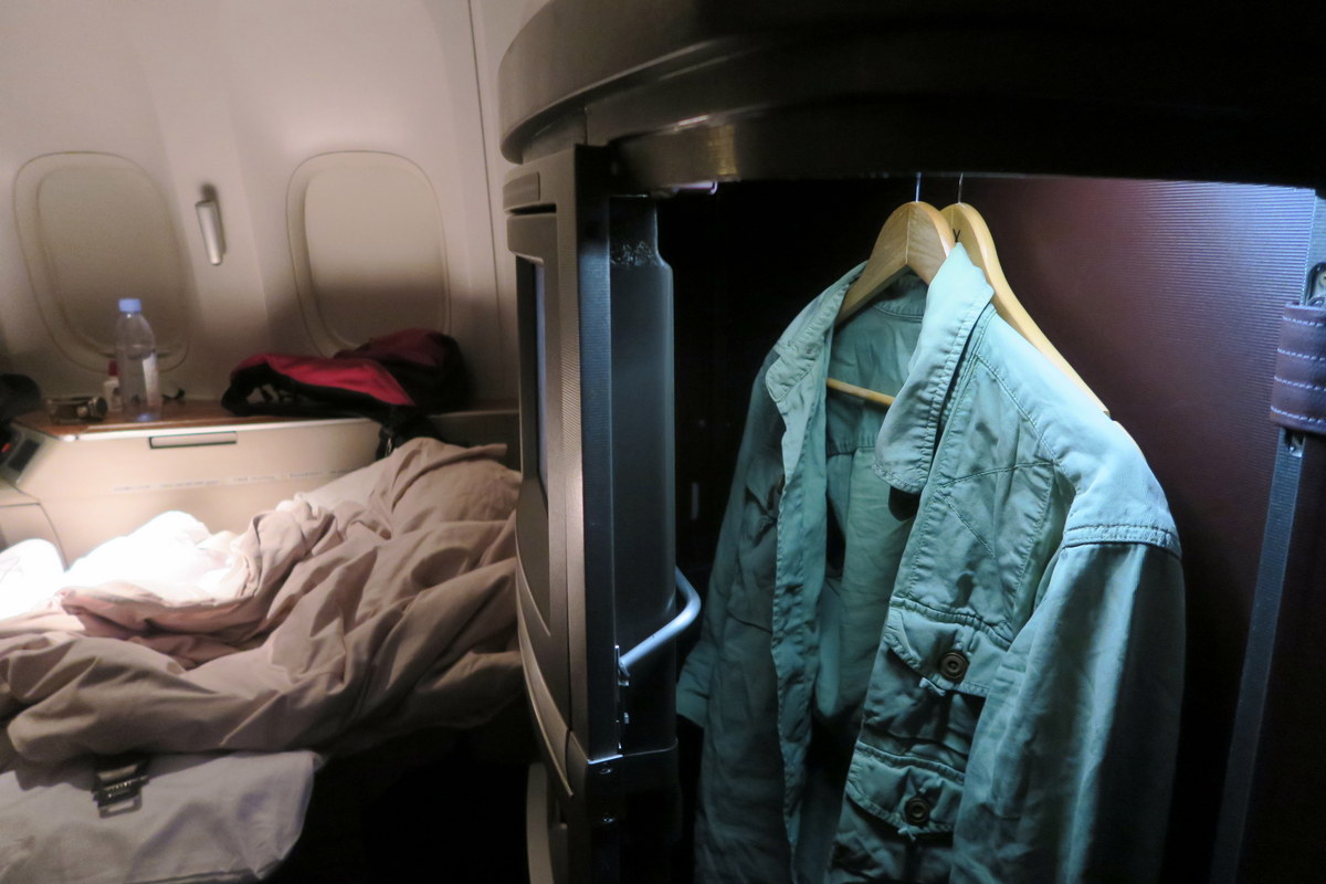 Вешаю снятые шмотки в шкаф. Тут у каждого пассажира свой шкаф с вешалками и всем таким есть. Ну и с подсветкой разумеется.