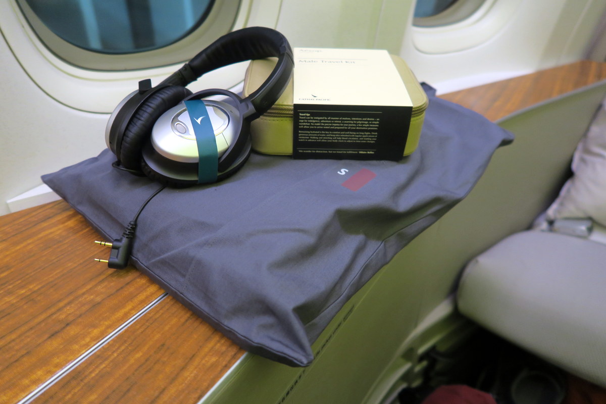 На подоконннике лежит то, что выдают пассажирам первого класса. Наушники, косметичку с мыльно-рыльными принадлежностями, и пижаму в матерчатой сумке. Да-да, пижаму выдают. Мы до неё ещё дойдём.