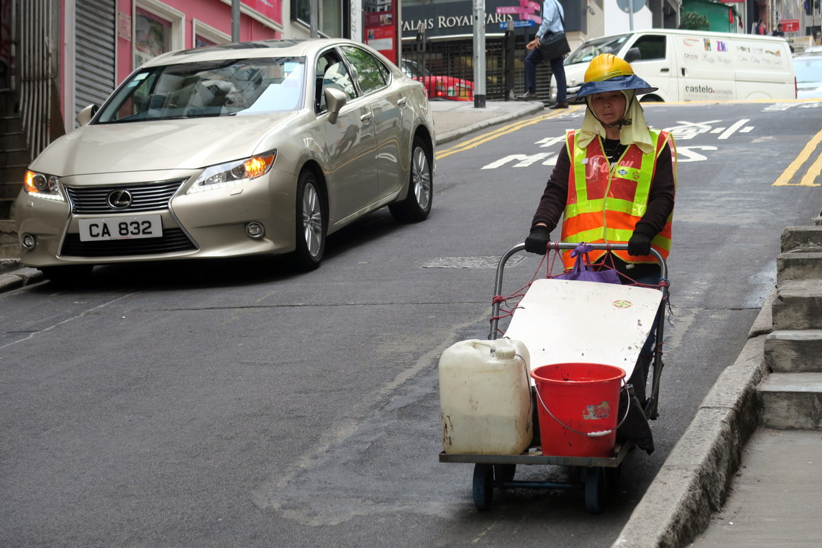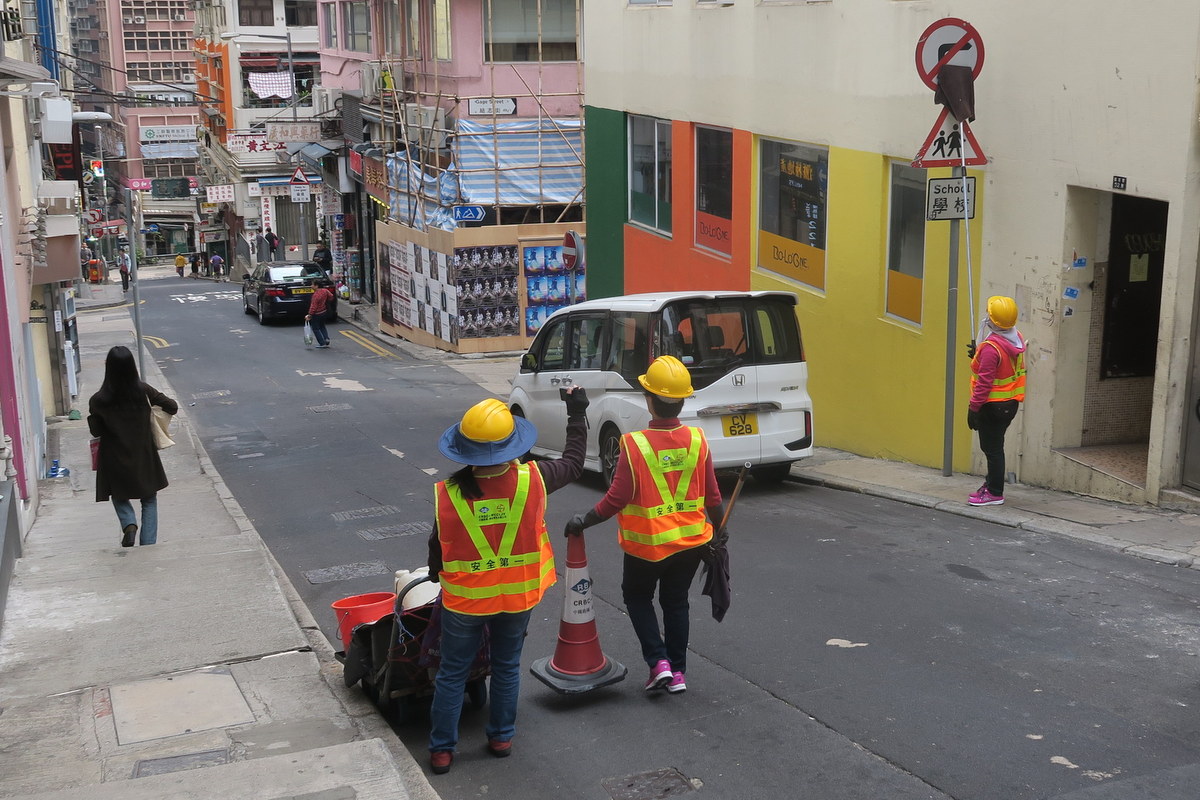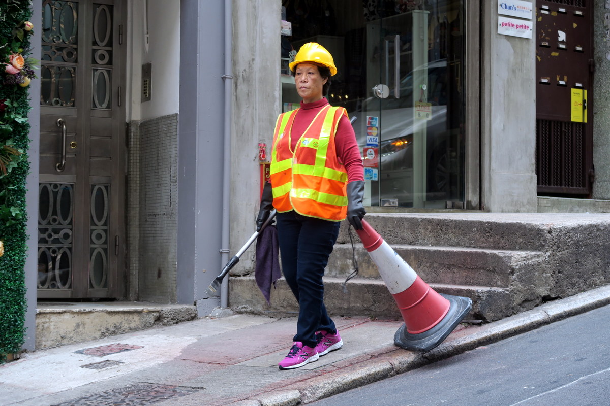 Наблюдал сегодня замечательный эпизод из жизни Гонконга. Спешу поделиться рассказом о том, как власти держат этот шумный и людный город в чистоте. Конечно же занимаются этим работники коммунальных служб. Вот одна из них.