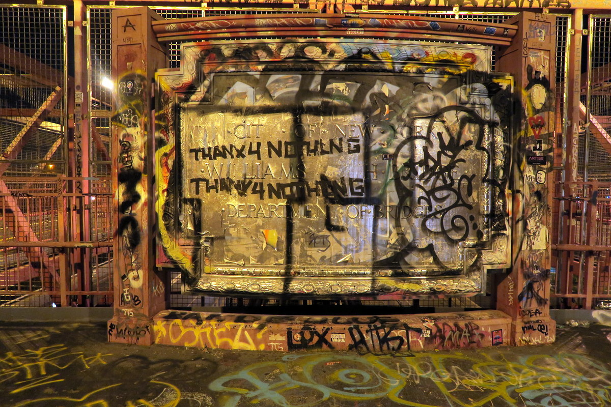 "Город Нью Йорк. Вилиамсбургский Мост. Департамент Мостов." - надпись еле читается из-за многолсойного исскусства поверх изначальных буков.