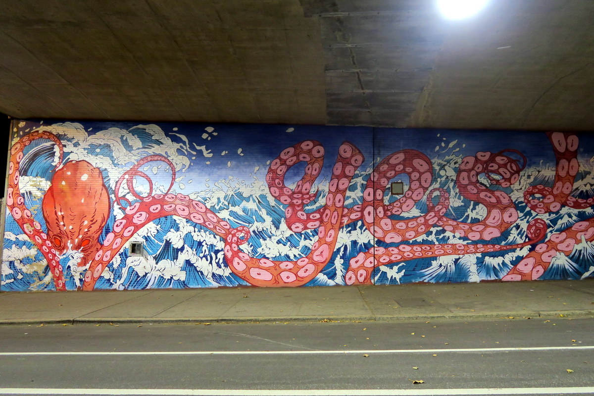 Местные художники всячески пытаются украсить этот унылый вид. Посмотрите какую милую композицию связали из шерсти: девочка и её кит!