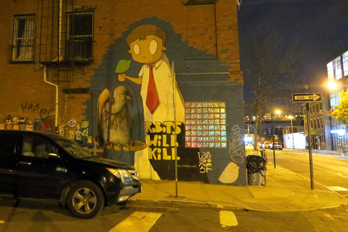 Ладно, нам надо поторапливаться, продолжаем шагать на юг, и заходим собственно в Вилиамсбург. Давным давно тут жили религиозные евреи и афро-американцы, но за последние 20 лет этот район стал эпицентром хипстерской культуры. Самые продвинутые хипстеры правда уже не могут себе позволить тут жить, и двигаются на восток, в Бушвик. Но в Вилиамсбурге до сих пор много прикольного стрит-арта.