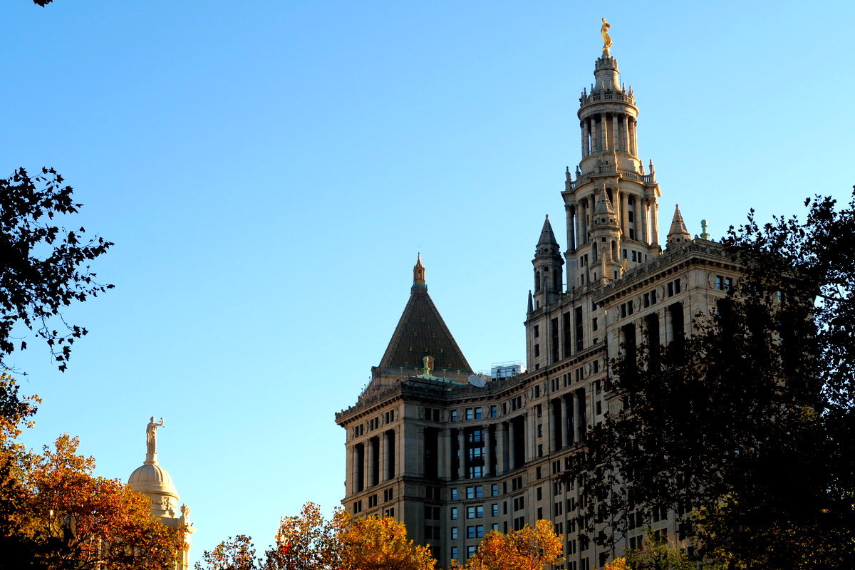 Спускаясь с моста мы окажемся в парке возле мерии. Тут есть красивый парк, окружённый старыми резными небоскрёбами. Наша прогулка закончилась, мы прошагали всю ночь, и увидели Нью Йорк таким, каким его редко кто-то видит.