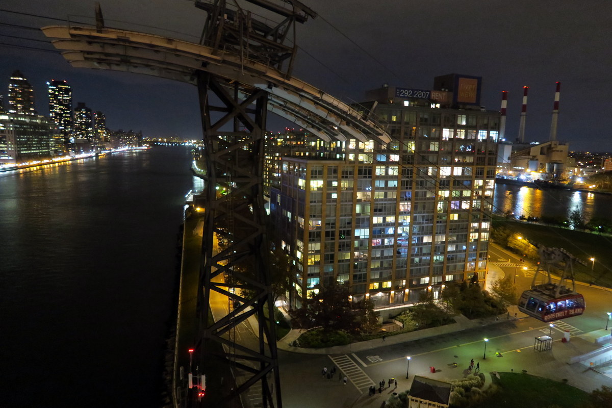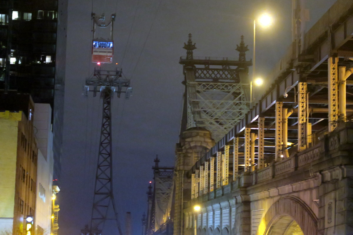 Рядом с мостом идёт единственная в Нью Йорке канатная дорога - она как раз и ходит на этот остров. Кабинки тут большие, вмещают много хипстеров (кто ещё стал бы жить на Рузвельт Айленде?) и их велосипеды.