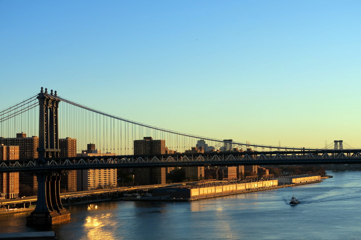 Отсюда прекрасно видно Манхэттенский мост, а вделеке торчат башни Вилиамсбургского. В лучах восходящего солнца эти мосты выглядят гордо и величаво.