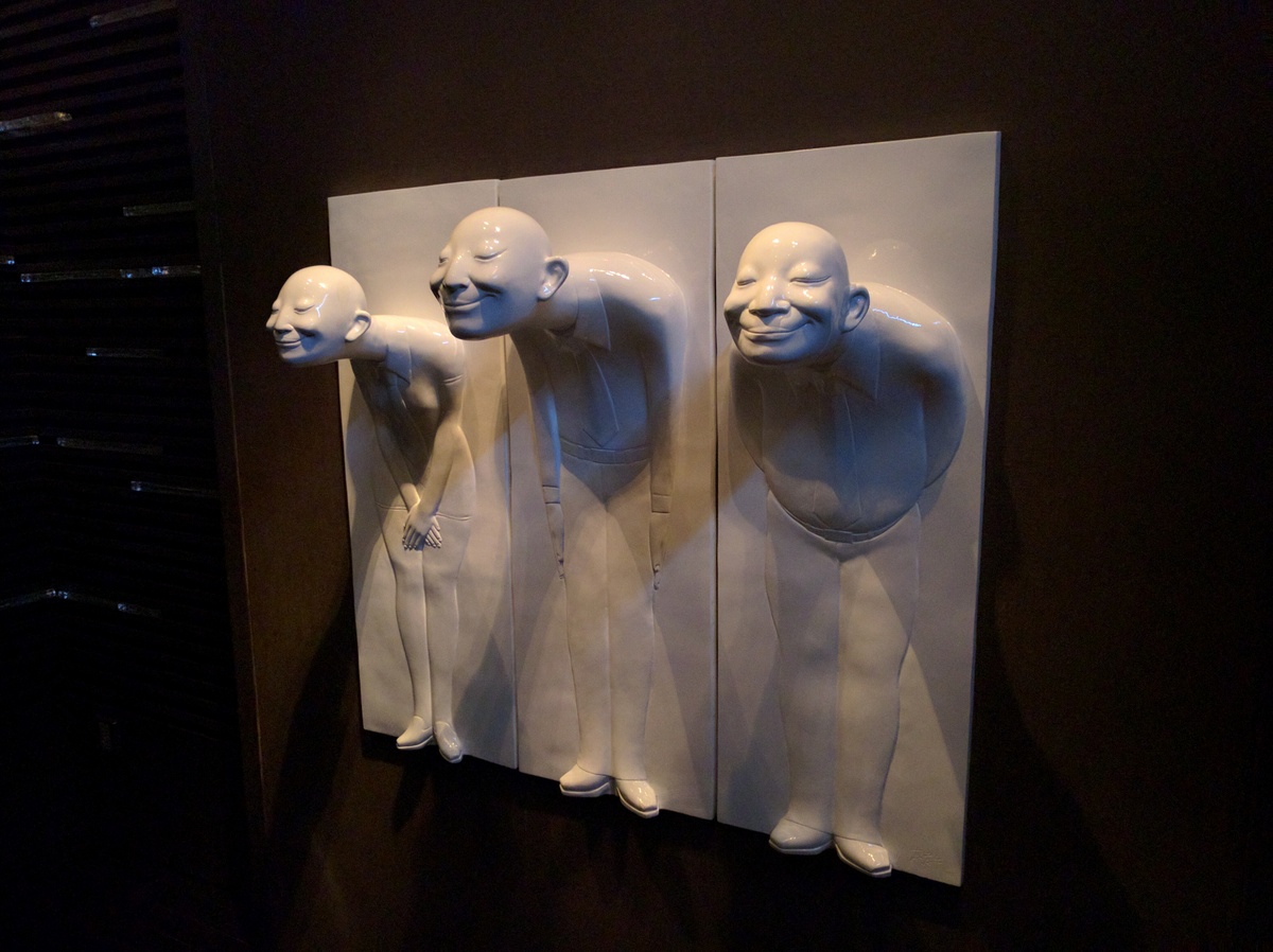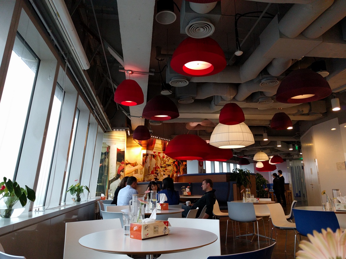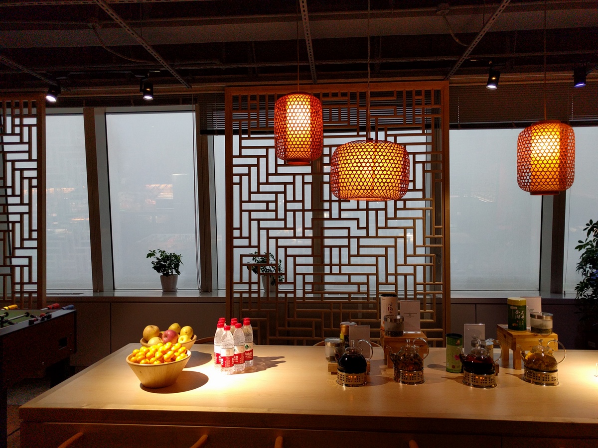 Тут не очень интересно - есть пару красивых зон, но в основном просто сидят и работают люди. Вот традиционная китайская чайная зона - на столе чайники с уже готовым чаем. А за окном всё то же облако.