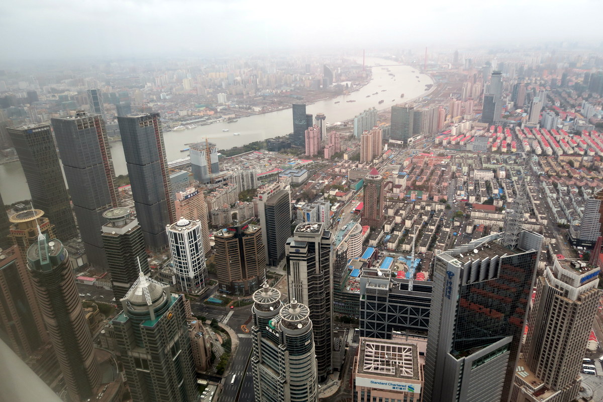 Наутро смотрю - распогодилось. И из моего окна вид открылся наконец! За окном видна река Хуанпу. Вокруг нас небоскрёбы, а вдалеке домики попроще.