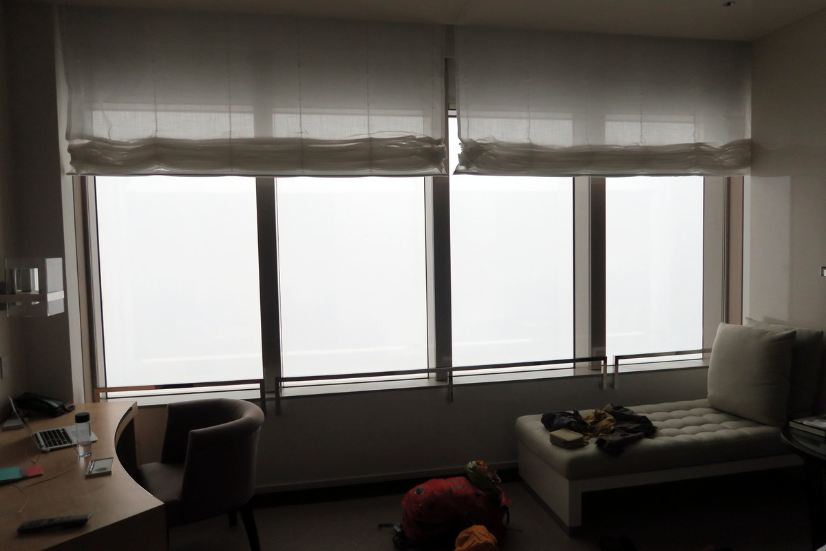 Наутро меня встречает прекрасный вид из окна. Вот такой. Просто серый кисель, и ничего не видно. Я на 80 этаже, а значит прямо внутри облака. Вроде ещё и дождь идёт.