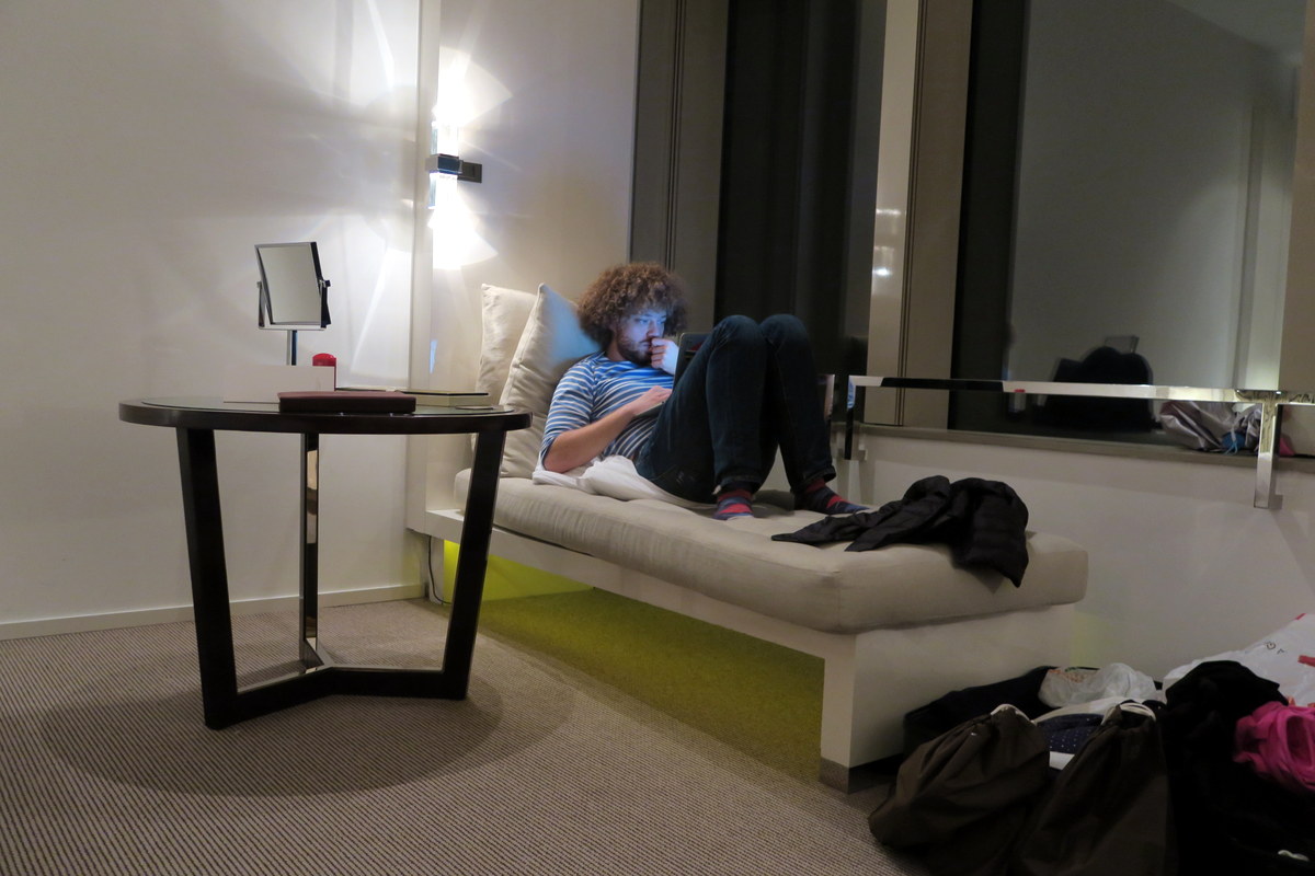 После работы проделал всю лифто-эскалаторную эпопею в обратном порядке. Зашёл к Варламову - он раньше меня прилетел, но вчера уже спал когда я приземлился. Он тоже купается в роскоши на отдельной кушетке. (На самом деле, он работает над очередным постом, чем занят очевидно в каждую свободную минуту.)