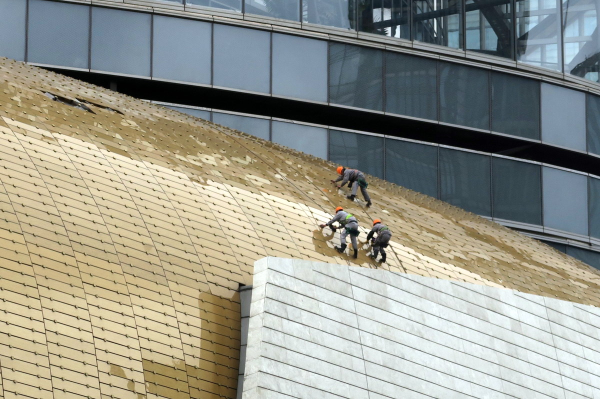 Официальная церемония открытия вот-вот состоится, и поэтому Шанхайскую башню активно протирают. Правда для этого нужна бригада с навыками альпинистов.