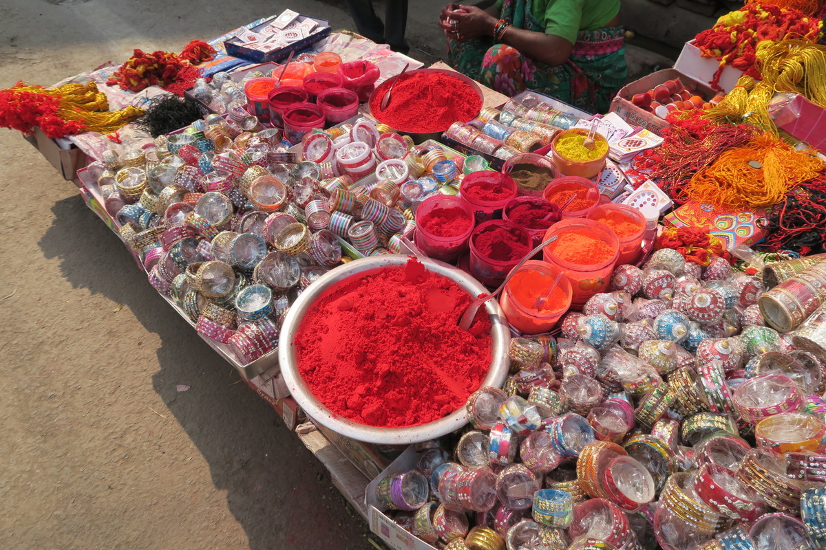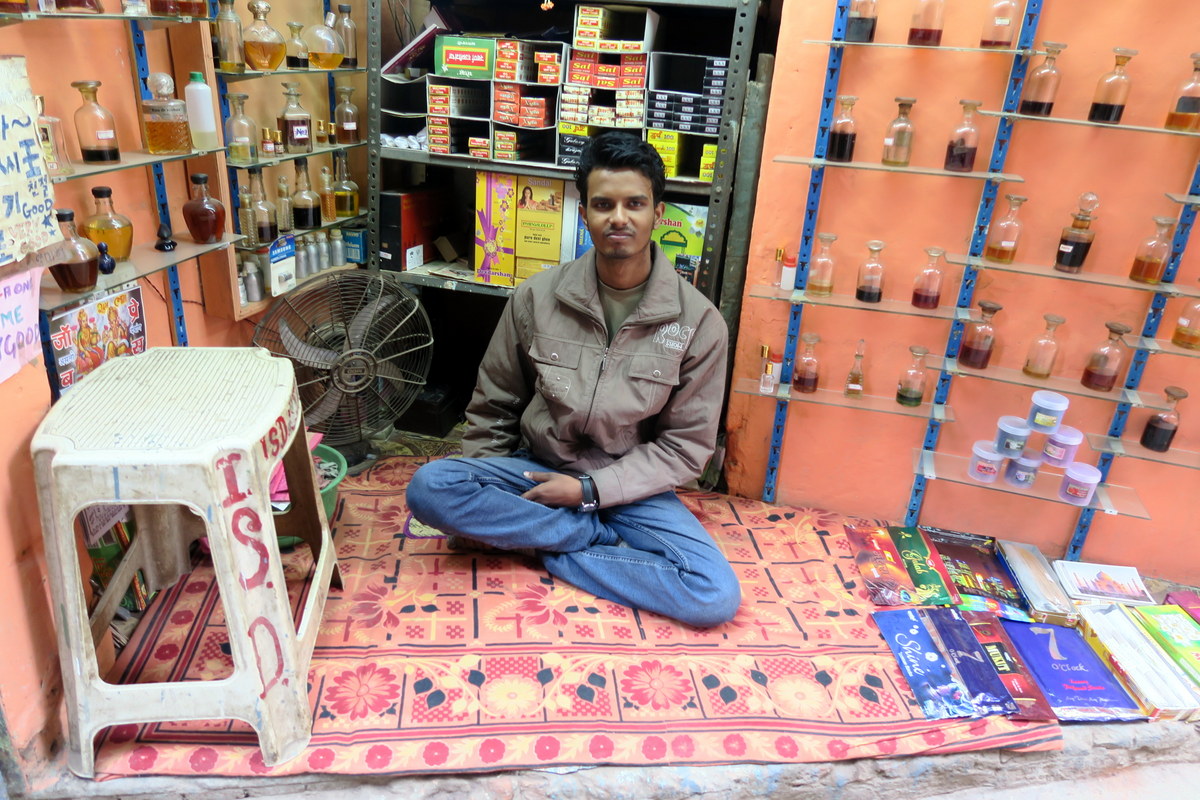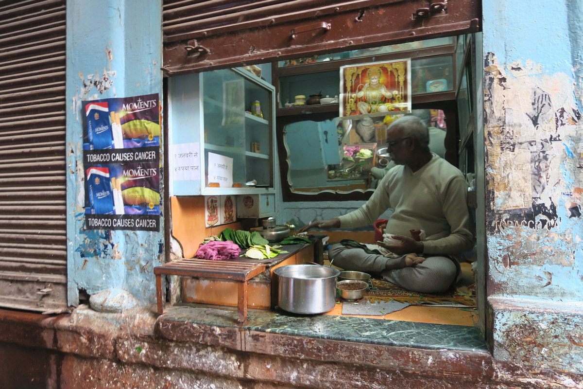 Или вот, из этой крохотной лавки мужик ротгует бетелевым орехом, энергетической жвачкой, которую индийцы жуют вместо кофе, и которая превращает их слюну в алую смесь. Вечером он складывает все принадлежности в сторону, расстилает подстилку и ложится тут спать, сказав на ночь молитву одному из божеств наклееных на его стены.