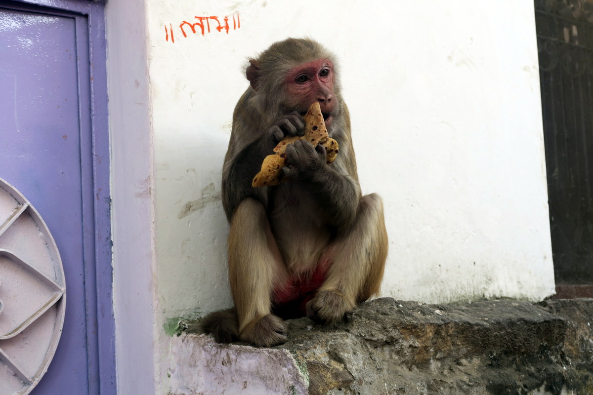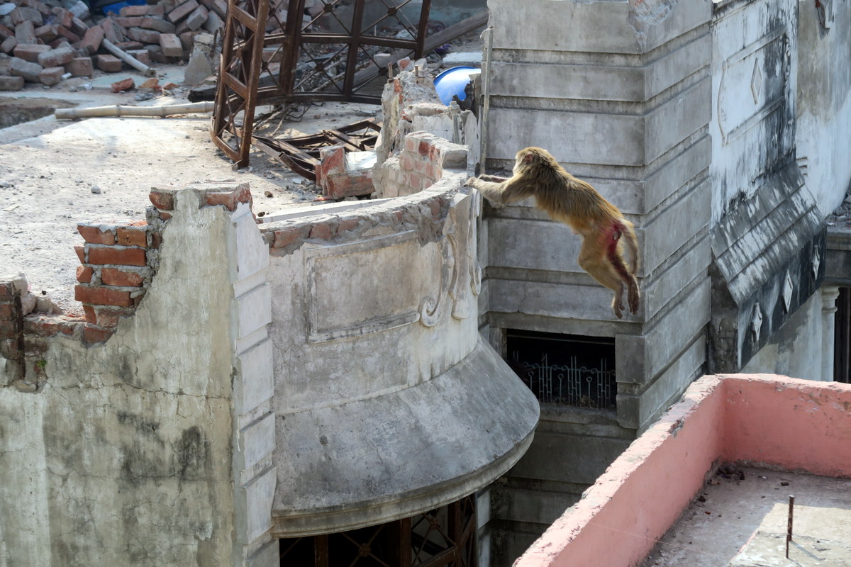 Обезьяны бегают от здания к зданию, прыгают с одной крыши на другую, в поисках чего-нибудь, что плохо лежит.
