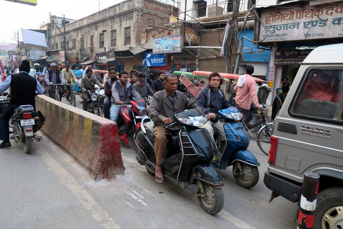 Выйдем немного из старого города. Как только улицы становятся чуть шире, начинается полная транспортная неразбериха. Мопеды и велорикши повсюду, тук-туки пытаются тоже как-то пролезть, но им здесь труднее.