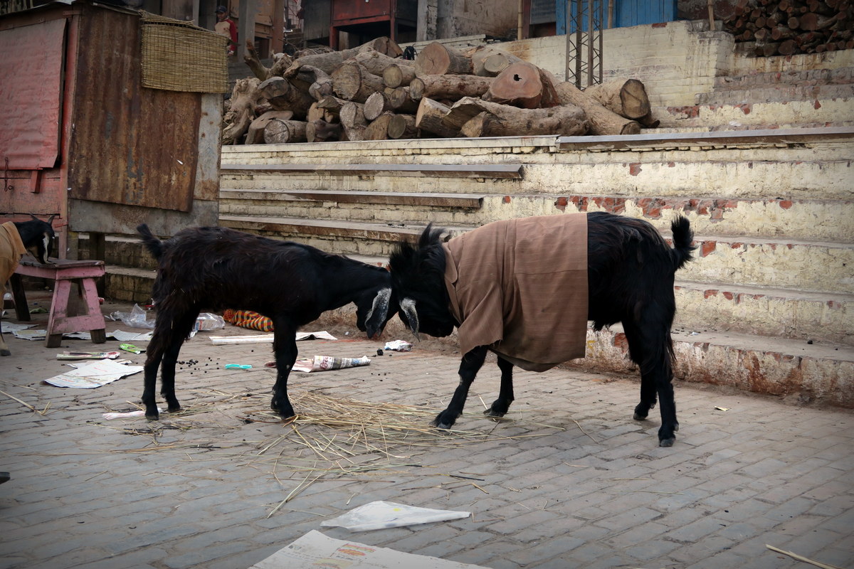 Раз уж мы вернулись всё же на гхаты, и заговорили о живности, скажу, что тут и козлы бывают. Смотрите, на одного из них хозяин нацепил свой старый пиджак - только рукава обрезал, чтоб не мешались.