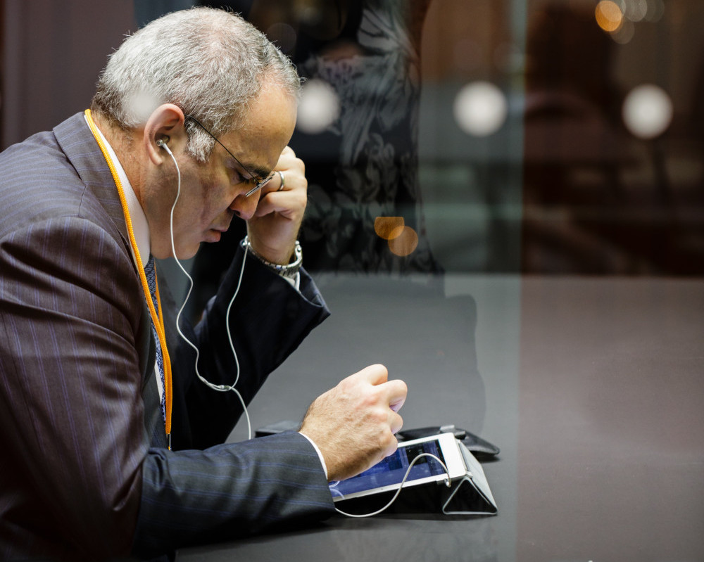 А эти мероприятия ведь как устроены? Допустим вот у нас Гарри Каспаров, бывший чемпион, победитель суперкомьютеров, да ещё и чуть ли не главный враг Владимира Путина. Разумеется он - главный спикер вечера. Ну а до него будет ещё несколько человек выступать менее масштабные персоны. То есть приезжает Каспаров туда, стоит за кулисами и ждёт своей очереди. Ну и Изя с ним соответственно тоже.