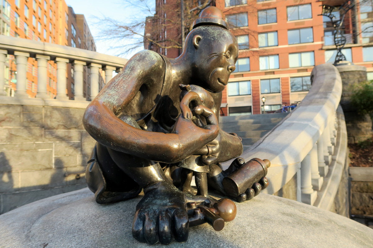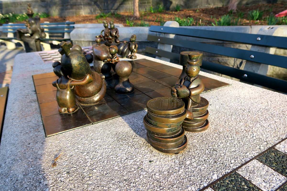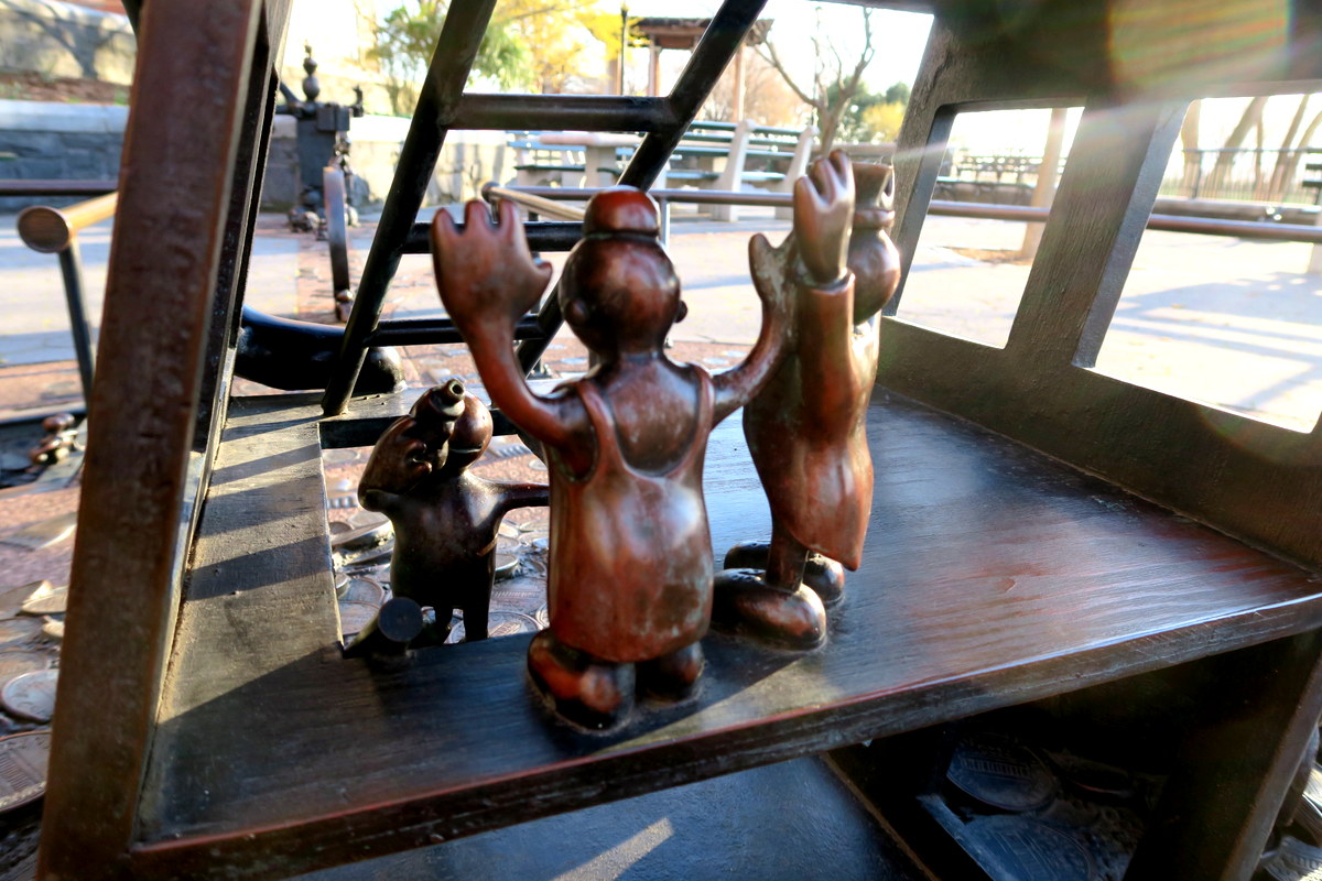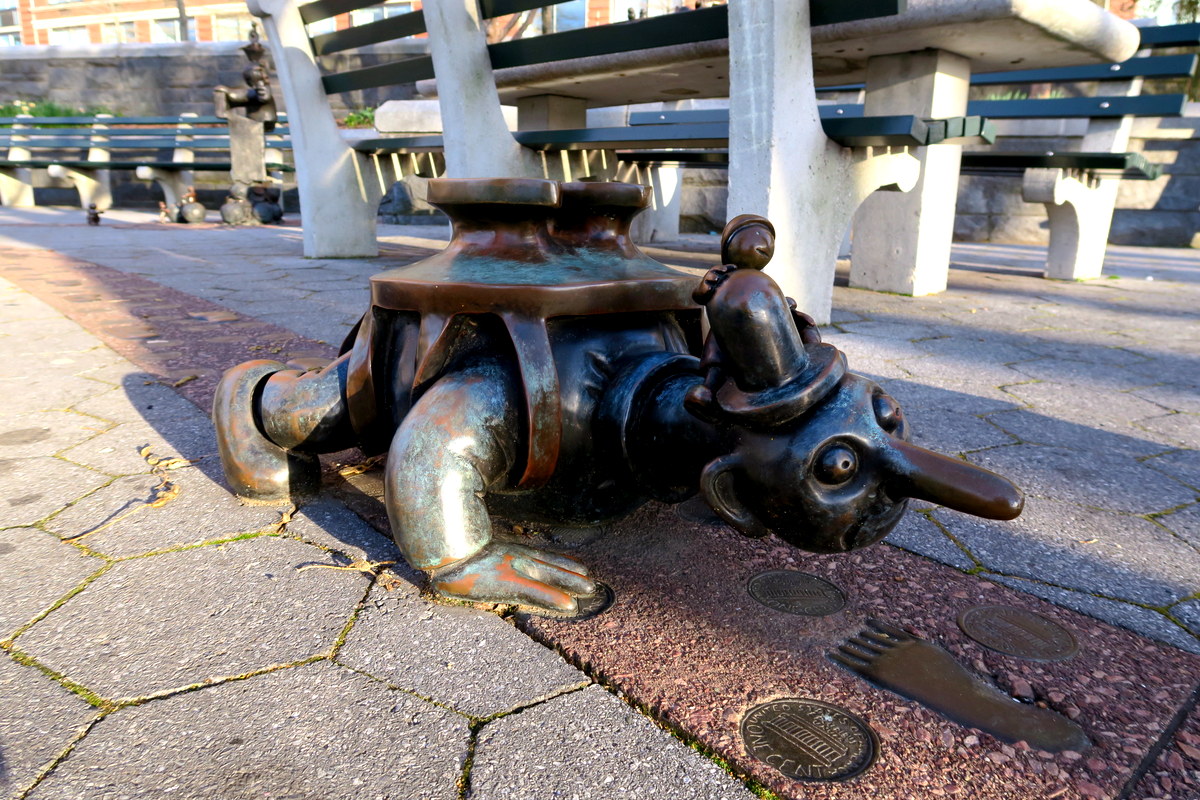В парке много деталей, которые очень легко упустить, если не особо внимательно всё разглядывать. Например бронзовые фигурки тут не только на земле, но и на фонарных столбах. Здесь Оттернесс изобразил смерть с косой, но маленькому человечку, который стоит у неё на плече, не страшно.