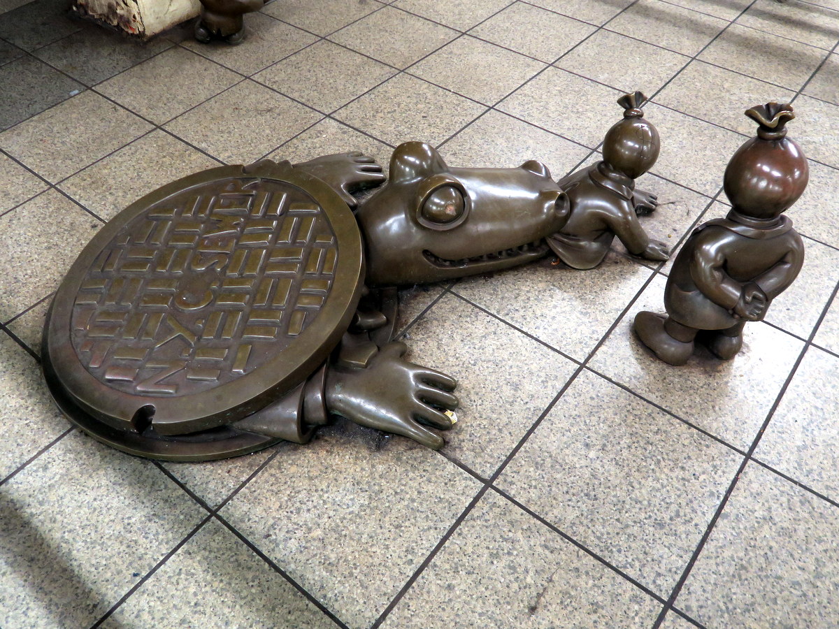На полу станции художник обыграл давнишнюю легенду о крокодилах, водящихся в нью-йоркской канализации. А заодно он показывает, что по его мнению должно случиться с богатыми мудаками. Открою вам маленький секрет: именно отсюда топовый блогер [Bad username: varlamov.ru] взял идею названия для своего знаменитого блога!