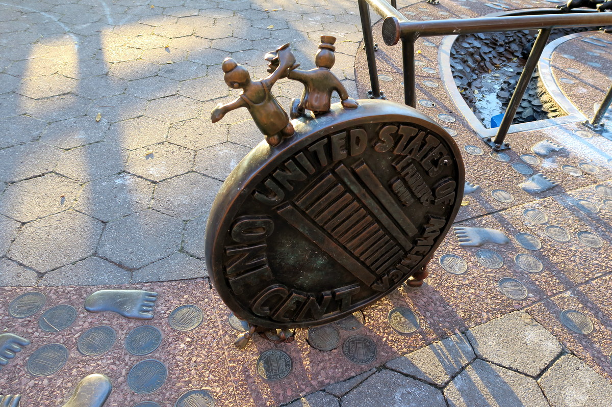 Как я уже сказал, работа Оттернесса часто подчёркивает связь власти и денег. Эта связь особенно на виду здесь, в Рокфеллер Парке, который находится в нескольких минутах ходьбы от финансового центра всей страны. Деньги - ну то есть центы - видны повсюду в этой инсталляции. Оттернесс использует в своих работах цент, потому что это самое маленькое количество денег, которое бывает в Америке. Кстати, вы не заметили ничего такого со всеми этими центами? Посмотрите на них прежде чем вы прочитаете дальше.