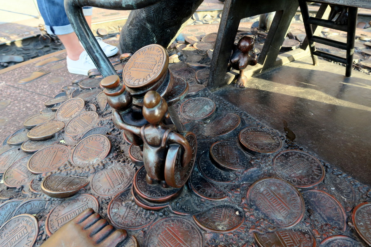 Это Американский художник-скульптор, его зовут Том Оттернес. В его бронзовых работах часто освещаются темы связи власти и денег. Он любит играть с различными масштабами (вы заметили крохотных человечков на фотографии выше?), в его работах деньги часто символизируются американскими одноцентовыми монетами.