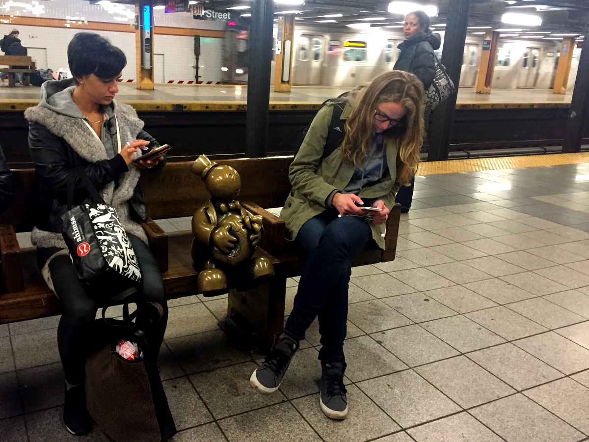 Ради метро, Том Оттернесс отступился от своей любимой одноцентовой монеты, и изобразил в руке этой девушки жетон метро. Такие уже давно не используют, но раньше, много лет назад, вход в метро Нью Йорка был по жетонам, которые продавались на станциях. Жетоны, как этот появились в 1995, когда цена на проезд поднялась до $1.50, и были отменены в 2003. После них, система оплаты полностью перешла на магнитные карты.