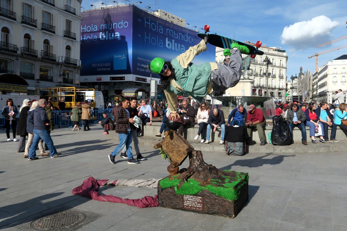 Пока я гулял по Мадриду, заметил, что в городе полно уличных артистов разных мастей. Живые статуи, музыканты, фокусники, люди в плюшевых костюмах мультяшных героев - всё это я видел раньше. Но персонажи зависшие в маловероятных позах в воздухе, держащиеся вроде как одной рукой, такого я нигде не встречал.