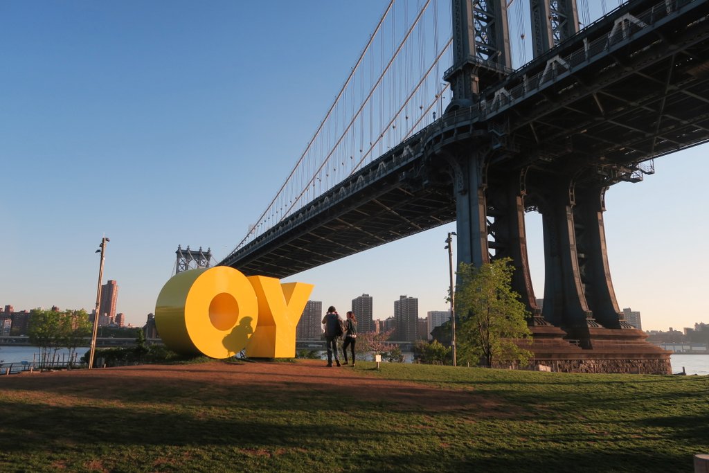 А вот рядом с Манхэттенским мостом, на бруклинской его стороне, поставили классную новую штуковину. Эта надпись изображает с одной стороны "OY", а с другой - "YO".