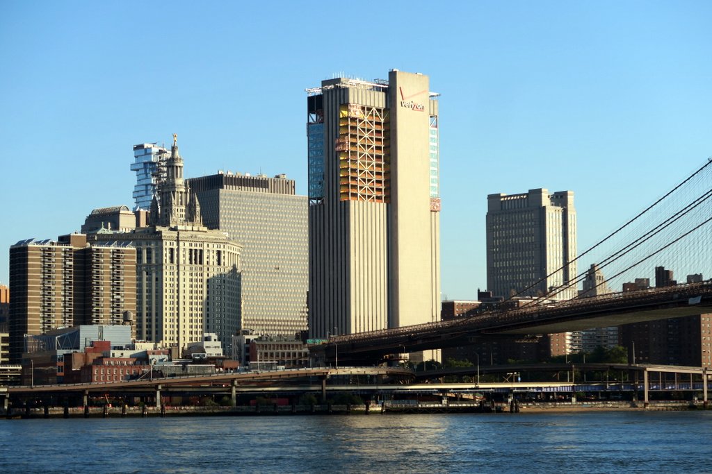 А на манхэттенской стороне, старое здание компании Verizon постепенно испытывает метаморфоз из гусеницы в бабочку. Раньше ето угрюмое здание по праву называли самым некрасивым во всём Манхэттене. Сейчас девелоперы расковыряли его фасад и добавляют к нему огромные окна, которые радикально изменят его внешний вид.