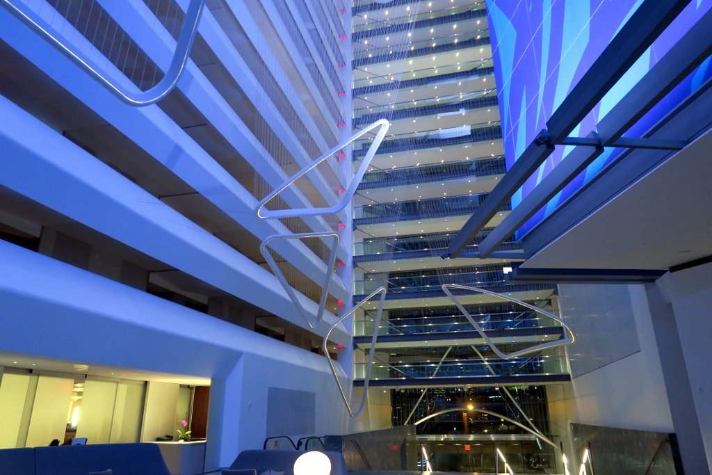 Рядом с Финансовым Центром стоит красивый отель Конрад. Он не сильно новый - его открыли в 2012, но я раньше о нём не писал, и вам не показывал. Главная достопримечательность отеля - 15-этажный атриум. Огромное вертикальное пространство заполнено красивыми геометрическими фигурами подвешенными с потолка. Здесь грамотная подсветка, и всё вместе производит эффект, что попал в фильм про будущее.