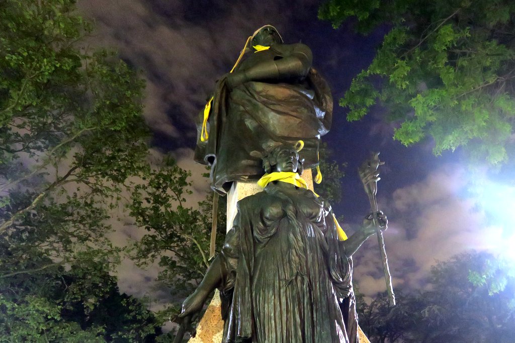 По Баттери Парку передвигают памятники. Макатун заявил, что вот эта скульптутная композиция - что-то новенькое. Действительно, на шеях фигур до сих пор намотаны жёлтые шарфики, как будто от холода. На самом деле, это лямки, за которые статую переносили подъёмным краном.